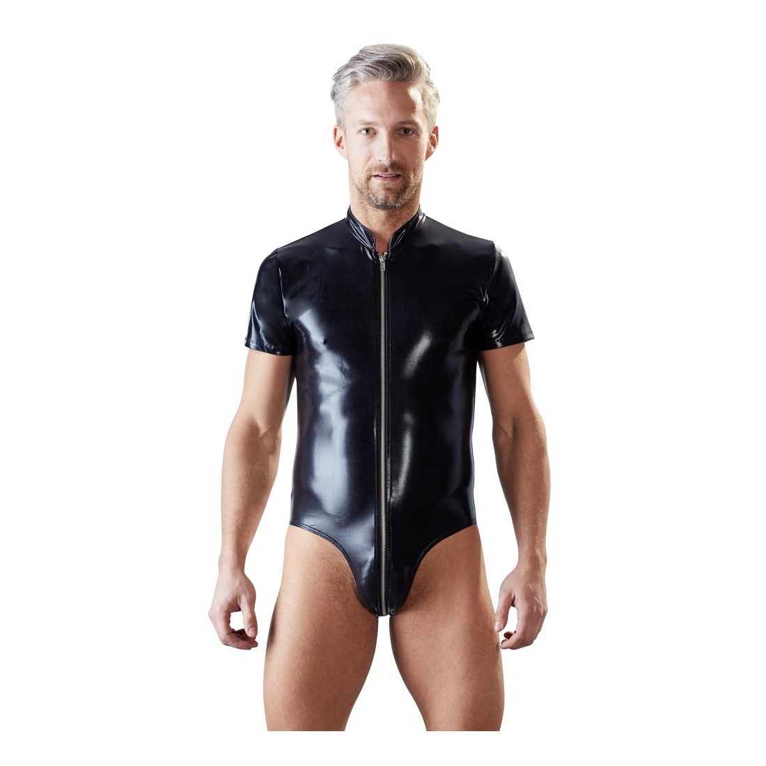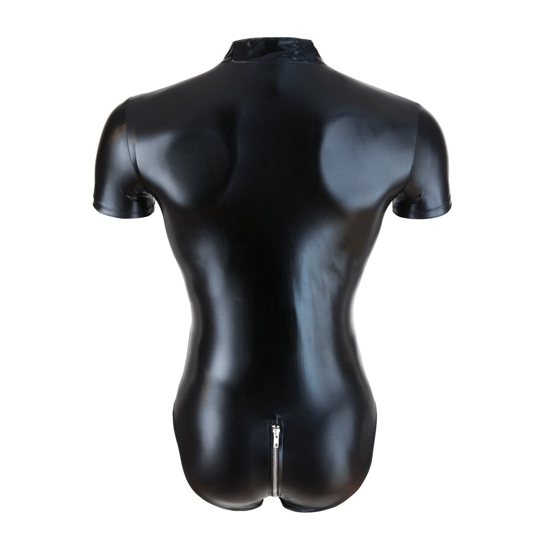 Body Wetlook con maniche corte e colletto rialzato e cerniera a 2 vie sotto, che attraversa tutta la parte anteriore fino al cavallo e al fondo. Gli orli delle gambe hanno un bordo stretto.