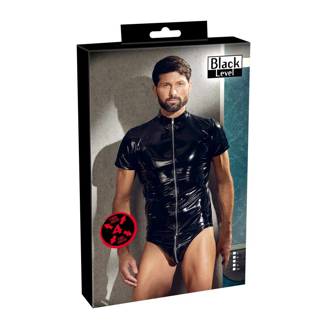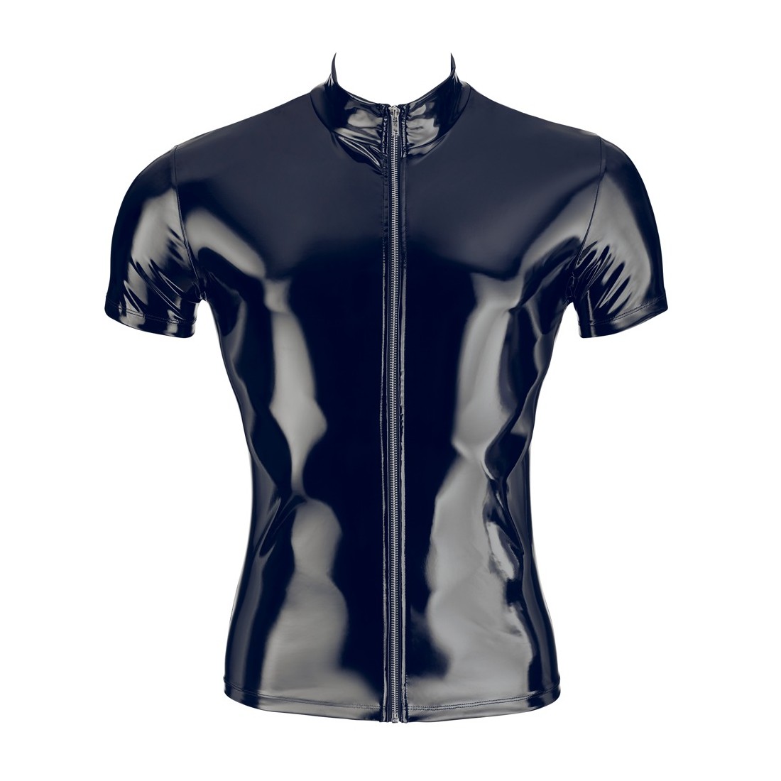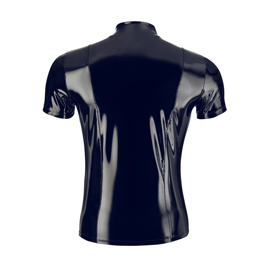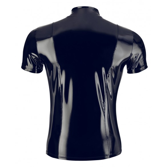 Camicia aderente alla figura con maniche corte e colletto rialzato. Realizzato in vinile altamente elastico a 4 vie e cerniera metallica sul davanti.