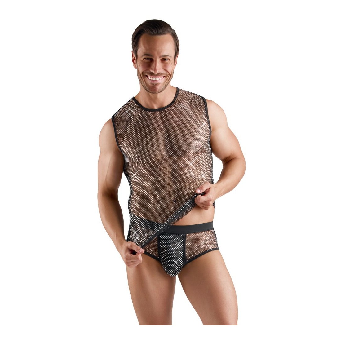 Camicia a rete senza maniche di Svenjoyment in un'eccitante trasparenza nera. Ricoperta da strass scintillanti. Aerea e morbida in ogni sua parte per il massimo comfort.