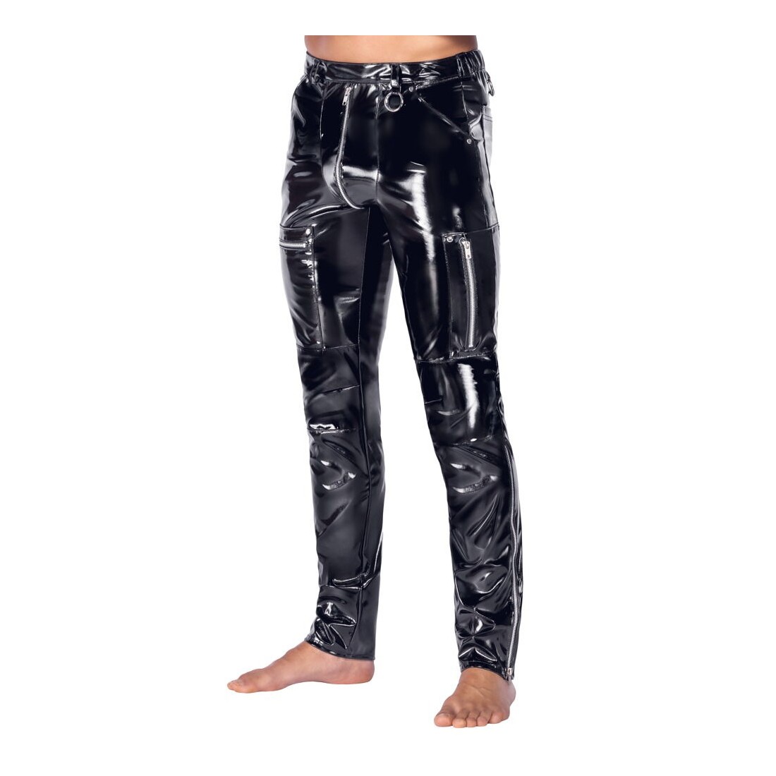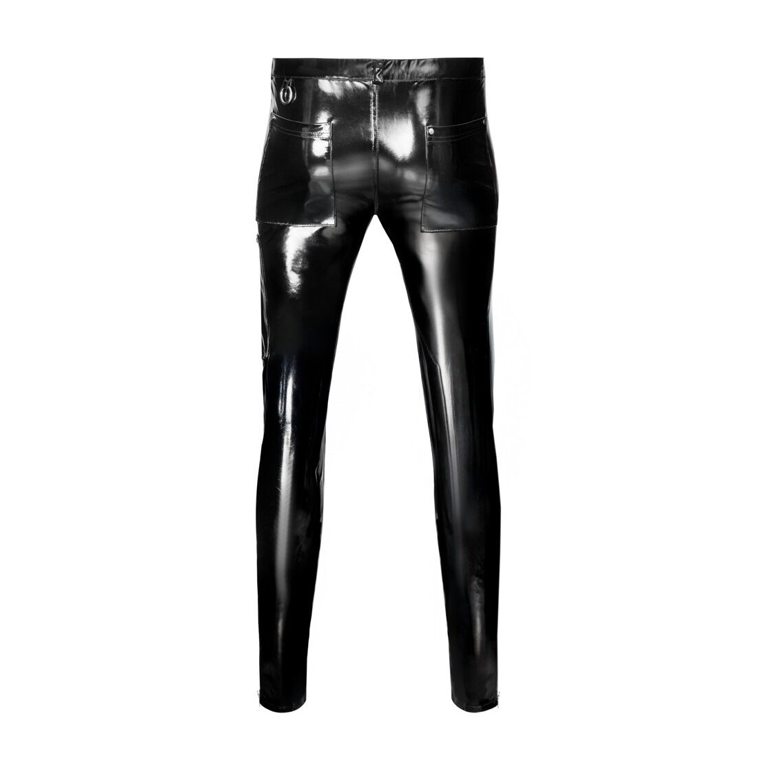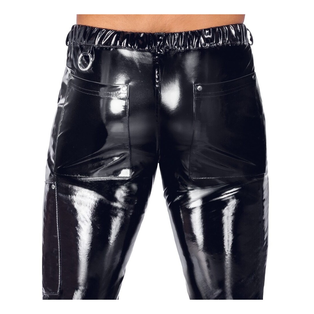 Pantaloni aderenti (skinny) in vinile di Black Level in nero lucido con dettagli in metallo argentato come rivetti, anelli e cerniere. Con tasche a fessura sul davanti e tasche applicate sul retro. Con cerniera sottopelle sul davanti e vita elasticizzata con passanti per cintura. Gamba stretta con tasche con zip applicate sulle cosce ed eleganti pinces al ginocchio per una maggiore libertà di movimento.