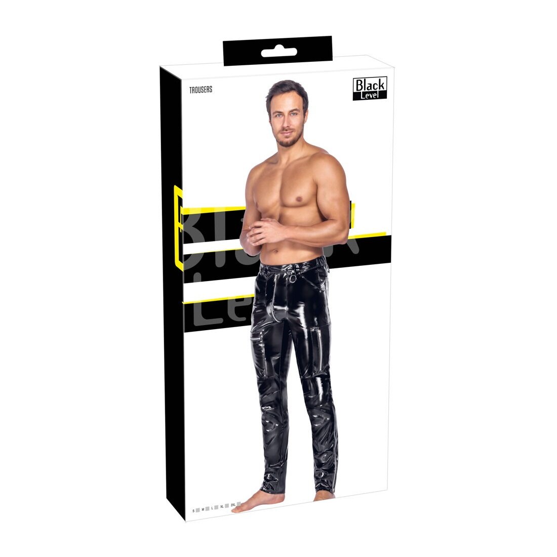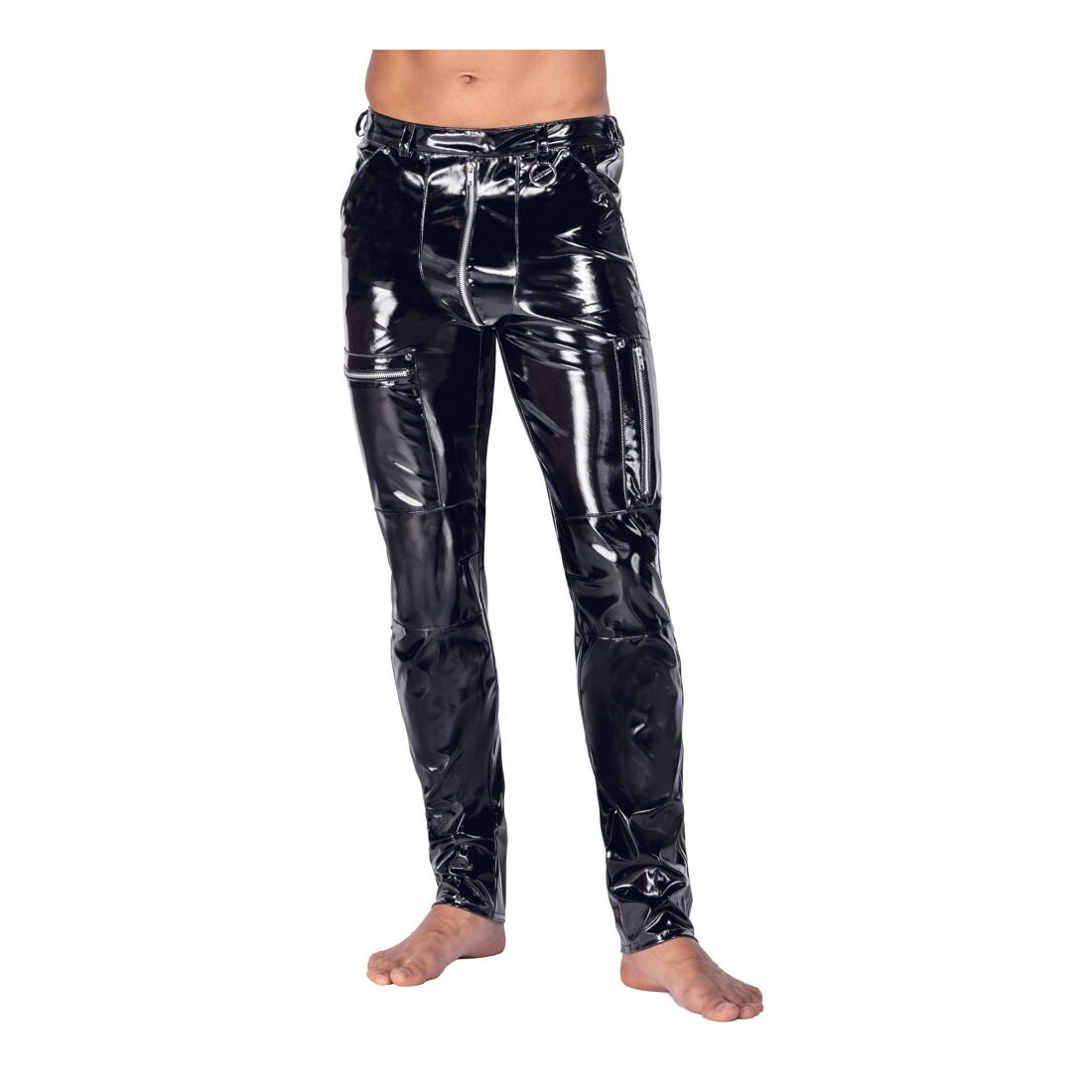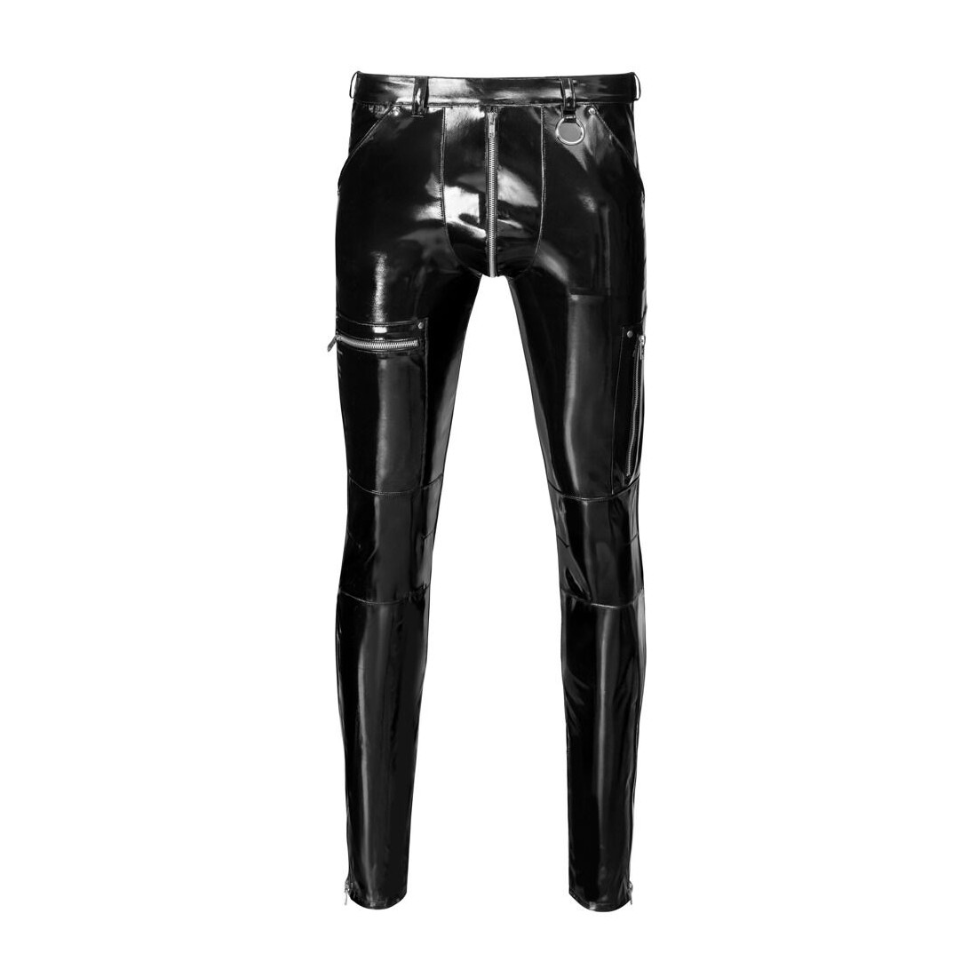 Pantaloni aderenti (skinny) in vinile di Black Level in nero lucido con dettagli in metallo argentato come rivetti, anelli e cerniere. Con tasche a fessura sul davanti e tasche applicate sul retro. Con cerniera sottopelle sul davanti e vita elasticizzata con passanti per cintura. Gamba stretta con tasche con zip applicate sulle cosce ed eleganti pinces al ginocchio per una maggiore libertà di movimento.