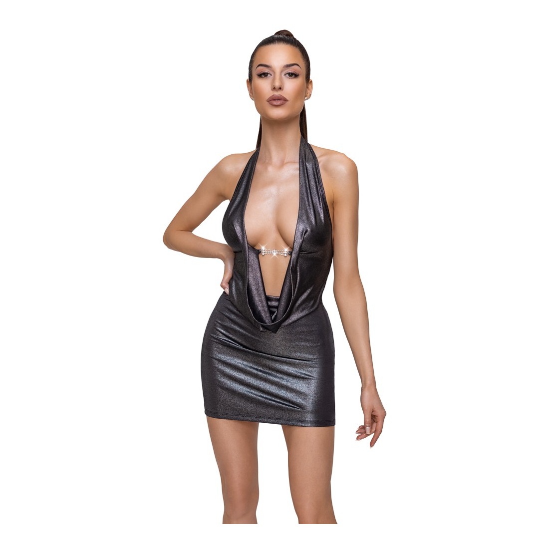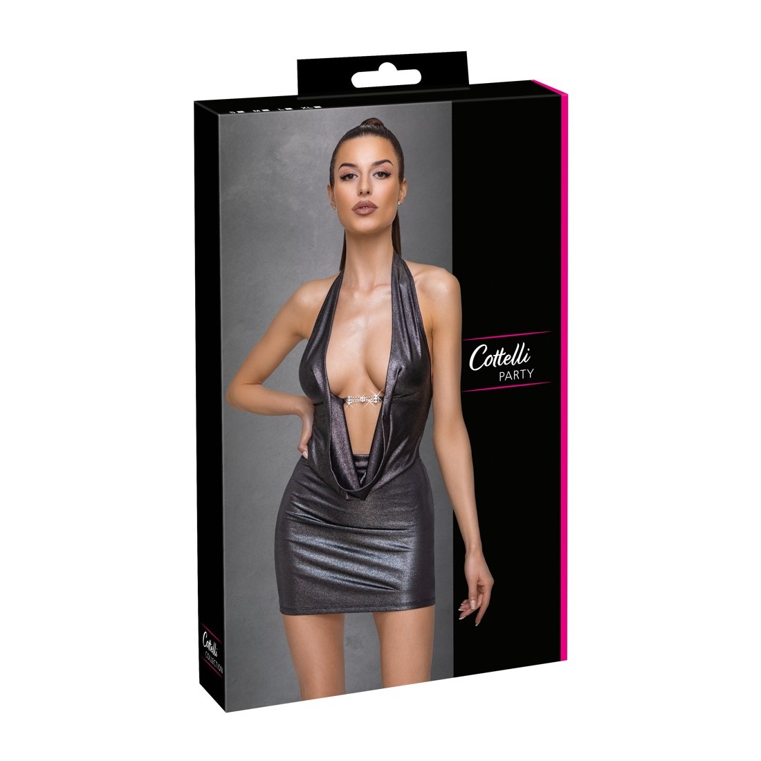 Abito corto di Cottelli PARTY in argento scintillante. Taglio aderente con profonda scollatura a cascata tenuta insieme solo da un fermaglio decorativo di strass. Con collo halter - eccitante senza schiena. Splendidamente elastico tutto intorno per una vestibilità aderente e un alto comfort di vestibilità.