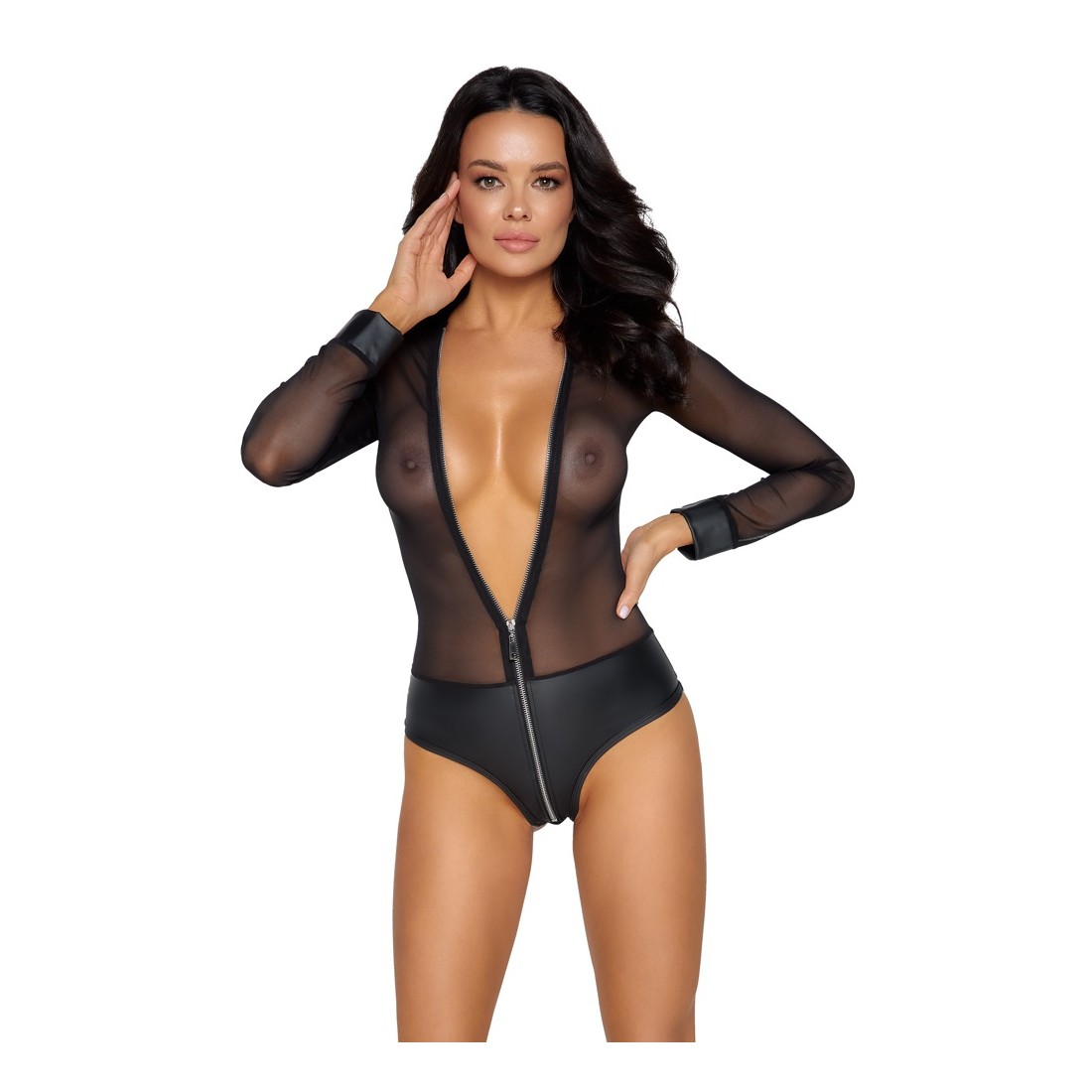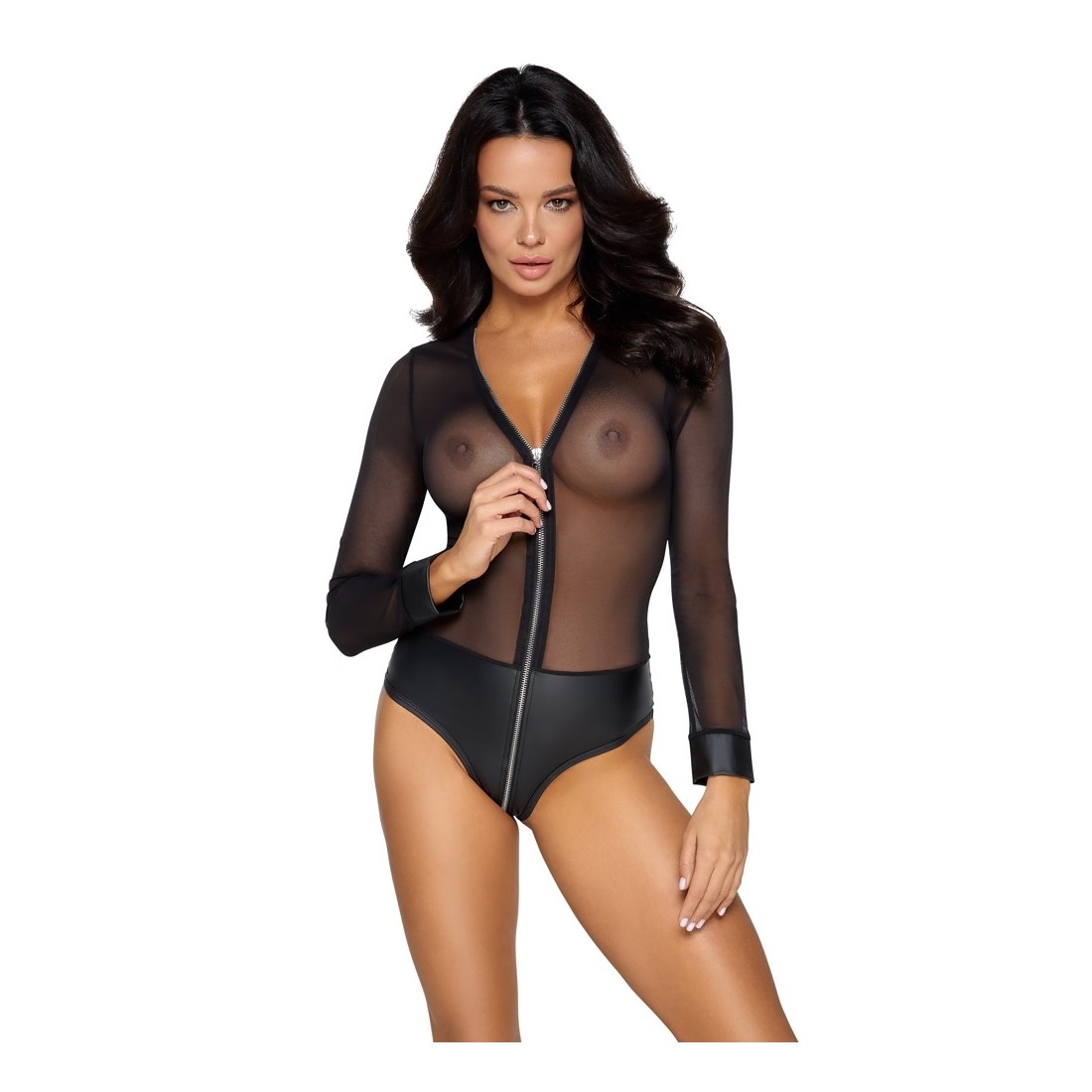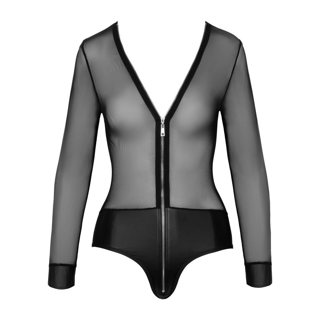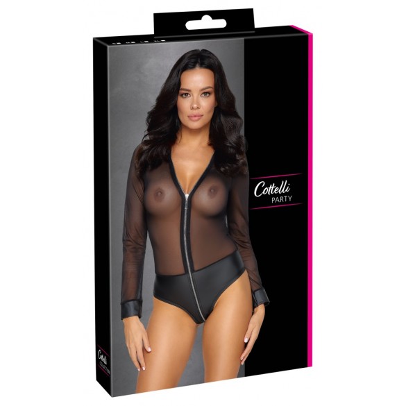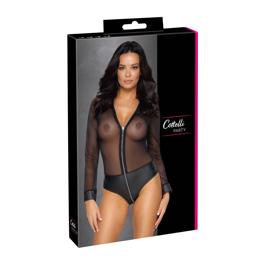 Body trasparente a maniche lunghe di Cottelli PARTY realizzato in fine powernet con mutandine opache integrate in un nobile aspetto opaco. Anche i polsini delle maniche hanno un aspetto opaco. Il suo tessuto morbido ed elastico offre un incredibile comfort aderente. La lunga zip color argento sul davanti si estende seducente dal collo al cavallo.