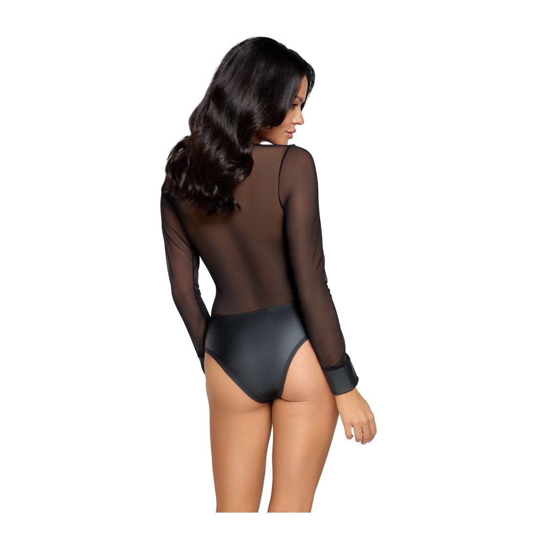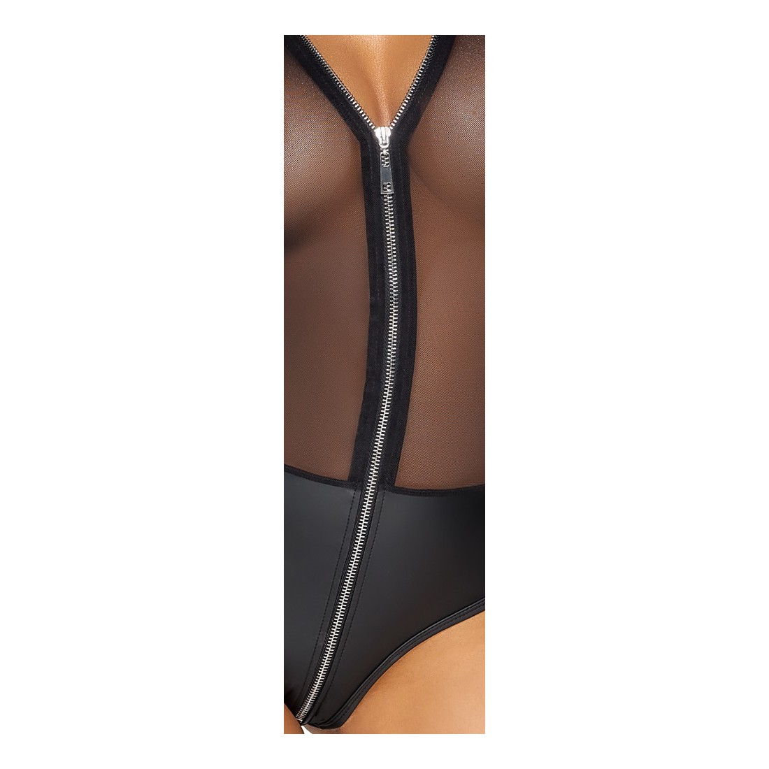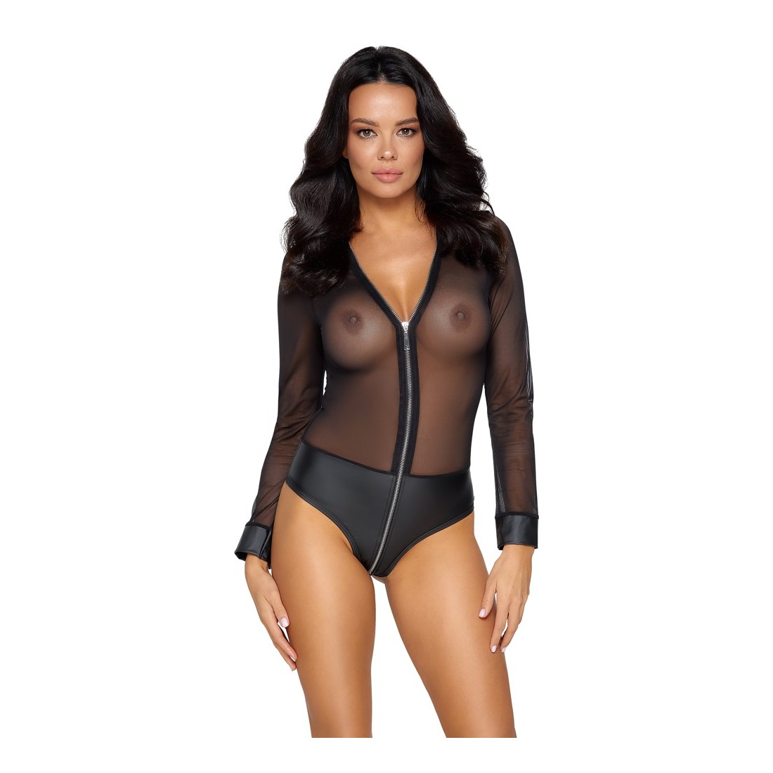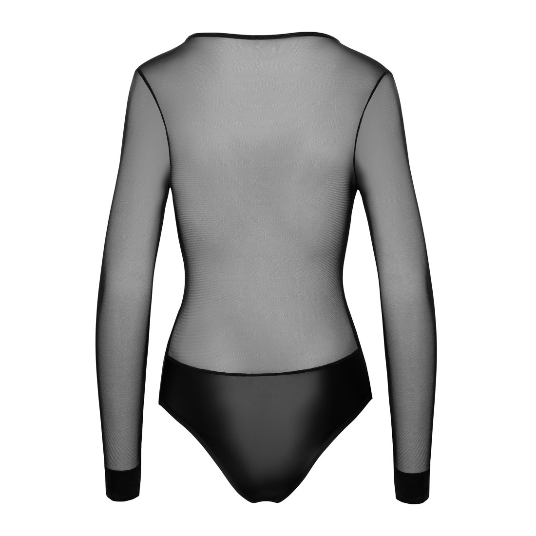Body trasparente a maniche lunghe di Cottelli PARTY realizzato in fine powernet con mutandine opache integrate in un nobile aspetto opaco. Anche i polsini delle maniche hanno un aspetto opaco. Il suo tessuto morbido ed elastico offre un incredibile comfort aderente. La lunga zip color argento sul davanti si estende seducente dal collo al cavallo.
