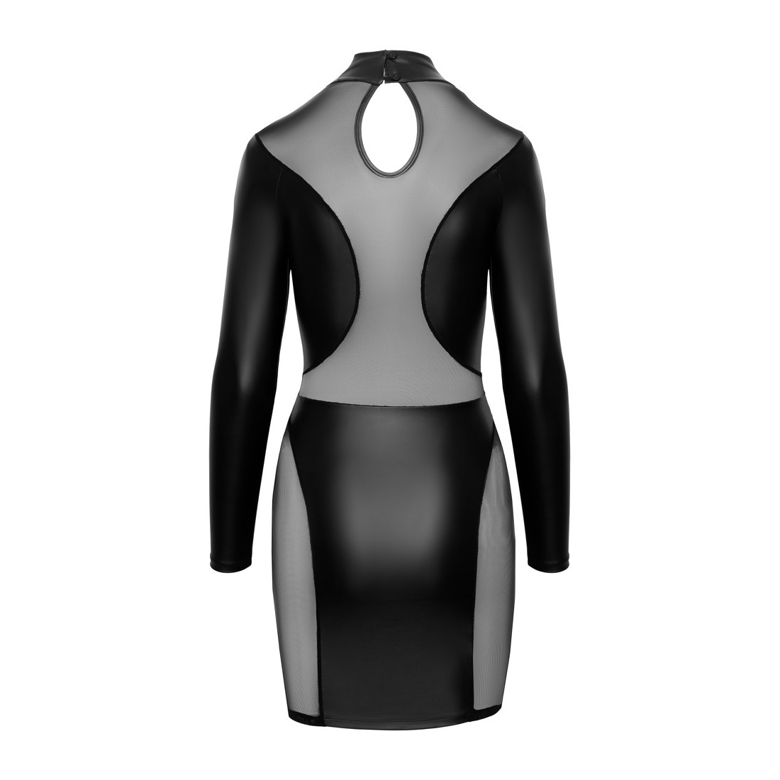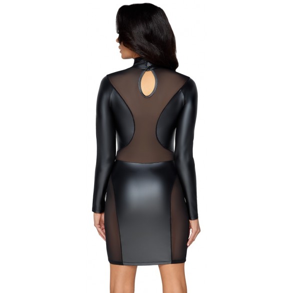 Abito attillato, corto, a maniche lunghe in un elegante look nero opaco con elementi powernet trasparenti davanti, dietro e ai lati della gonna. Morbido ed elastico per una vestibilità aderente e un elevato comfort. Il colletto in piedi presenta 2 bottoni nella parte posteriore del collo e un piccolo taglio sotto.