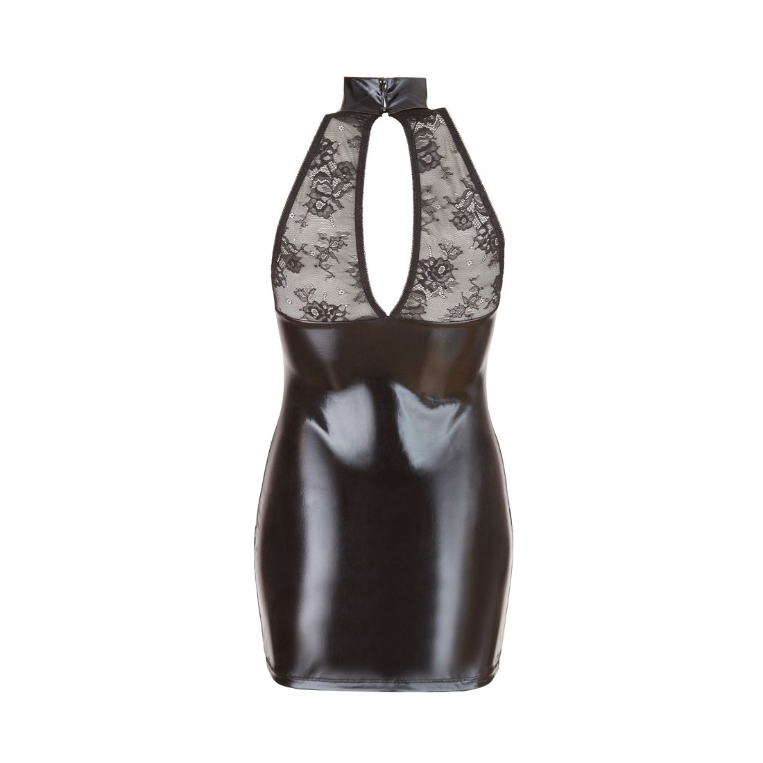 Questo abito corto nero di Cottelli PARTY combina un look bagnato lucido con inserti di pizzo fine sul décolleté e sulla schiena. Si adatta perfettamente e presenta le curve femminili in un modo sexy da togliere il fiato! Colletto rialzato con 2 bottoni al collo.