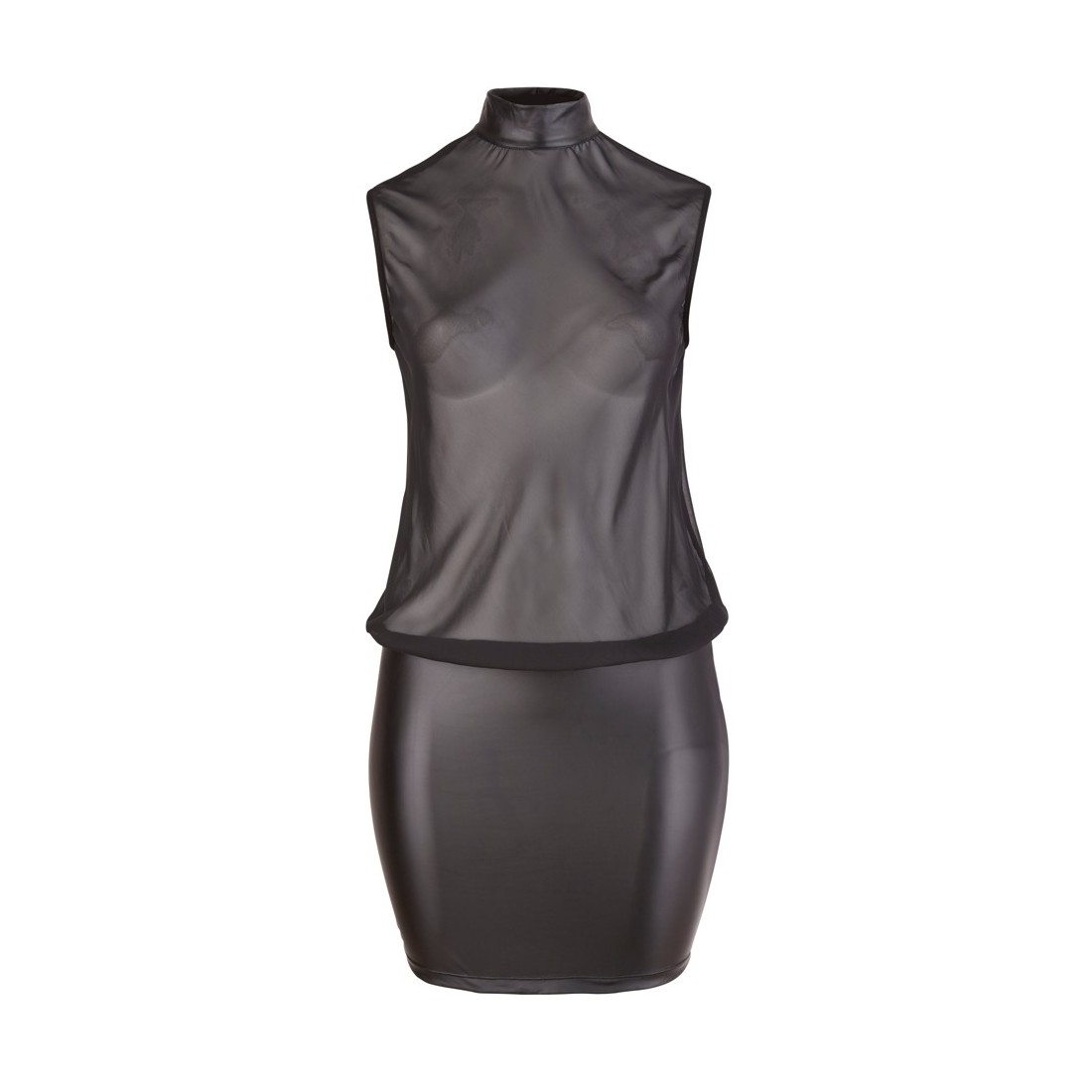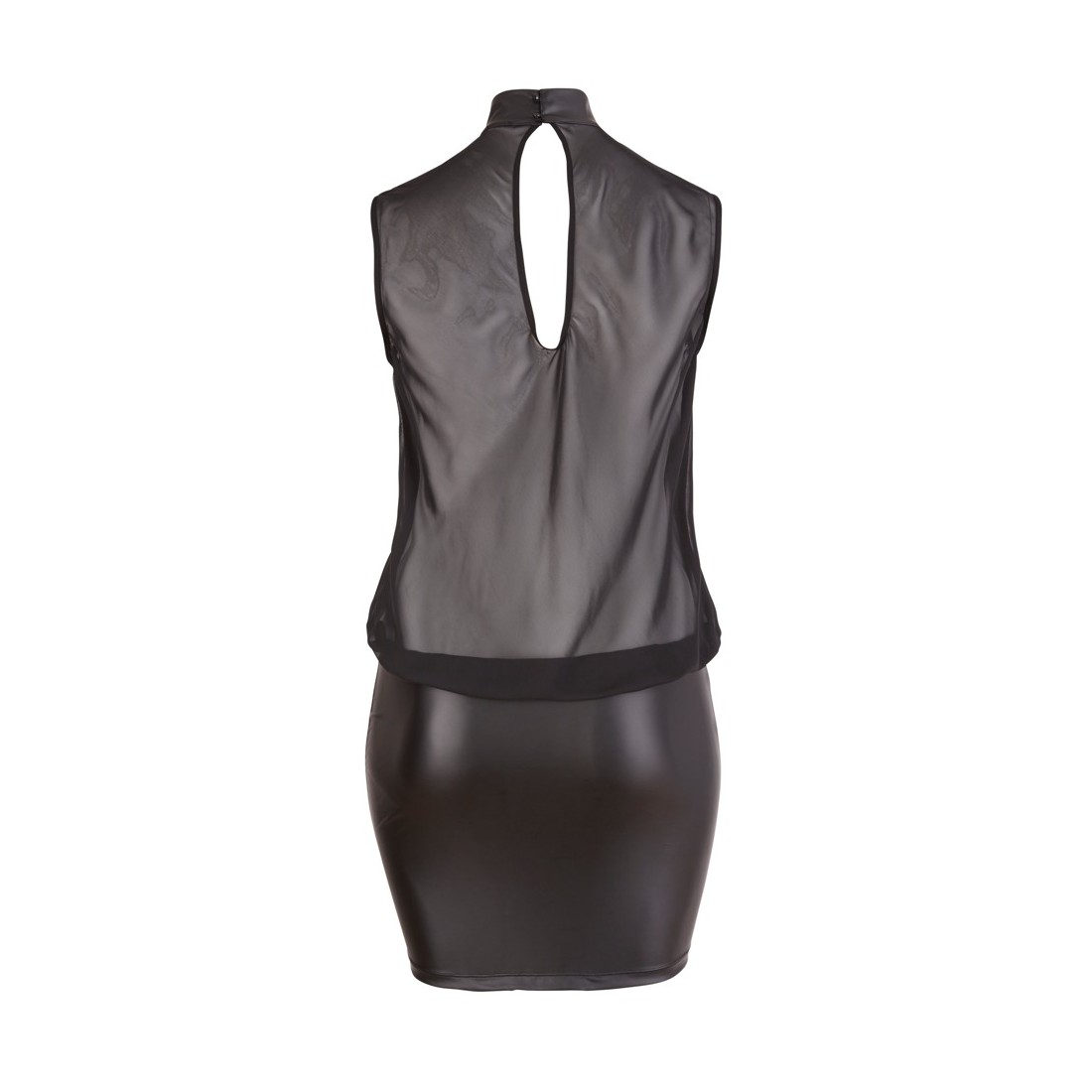 Questo mini abito nero è a cuore aperto e rivelatore allo stesso tempo, perché il top senza maniche in tessuto trasparente è tagliato molto largo e largo e lusinga le tue curve. Solo nella parte posteriore mostra la pelle nuda grazie alla scollatura. Al collo, un piccolo colletto rialzato con due bottoni arrotonda l'abito verso l'alto. La gonna opaca, lucida e coprente, invece, è aderente e quindi il contrasto perfetto con il top. Se non è una combinazione di successo!