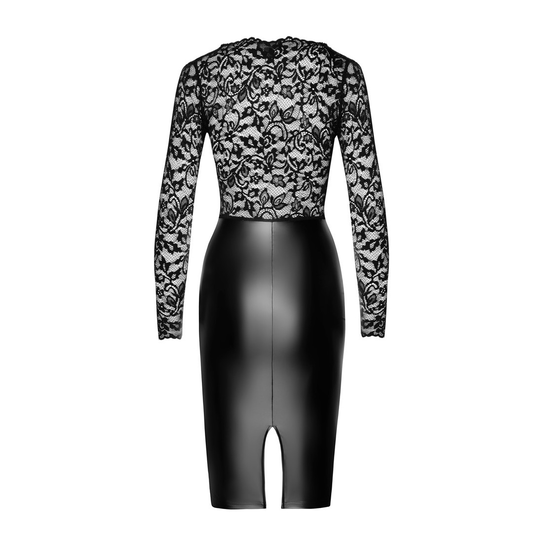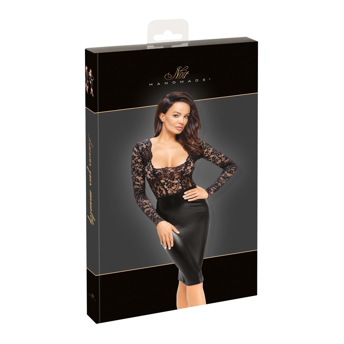 Abito di Noir lungo fino al ginocchio. Taglio aderente con top in pizzo morbido ed elasticizzato e gonna in un sofisticato e morbido look powerwet. Con maniche lunghe e un'eccitante scollatura. Piccolo spacco sul retro.