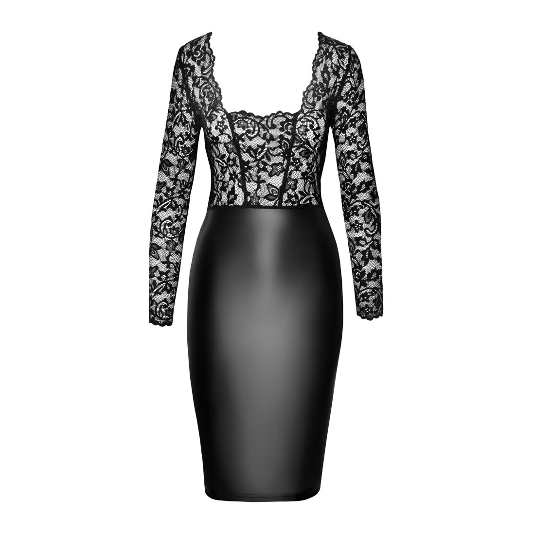 Abito di Noir lungo fino al ginocchio. Taglio aderente con top in pizzo morbido ed elasticizzato e gonna in un sofisticato e morbido look powerwet. Con maniche lunghe e un'eccitante scollatura. Piccolo spacco sul retro.