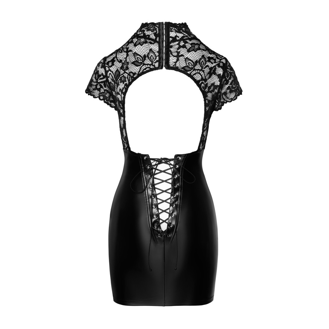 Abito corto e attillato di Noir in un mix di materiali nobili neri: pizzo delicato (parte superiore) e powerwetlook opaco e lucido (parte della gonna). Morbido ed elastico su tutto il perimetro per un elevato comfort di vestibilità. Con maniche corte e bellissimo collo alto, chiusura a gancio sul retro. Vista posteriore molto raffinata con schiena libera e allacciatura aperta variabile nella parte della gonna dalla vita al fondo.
