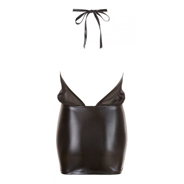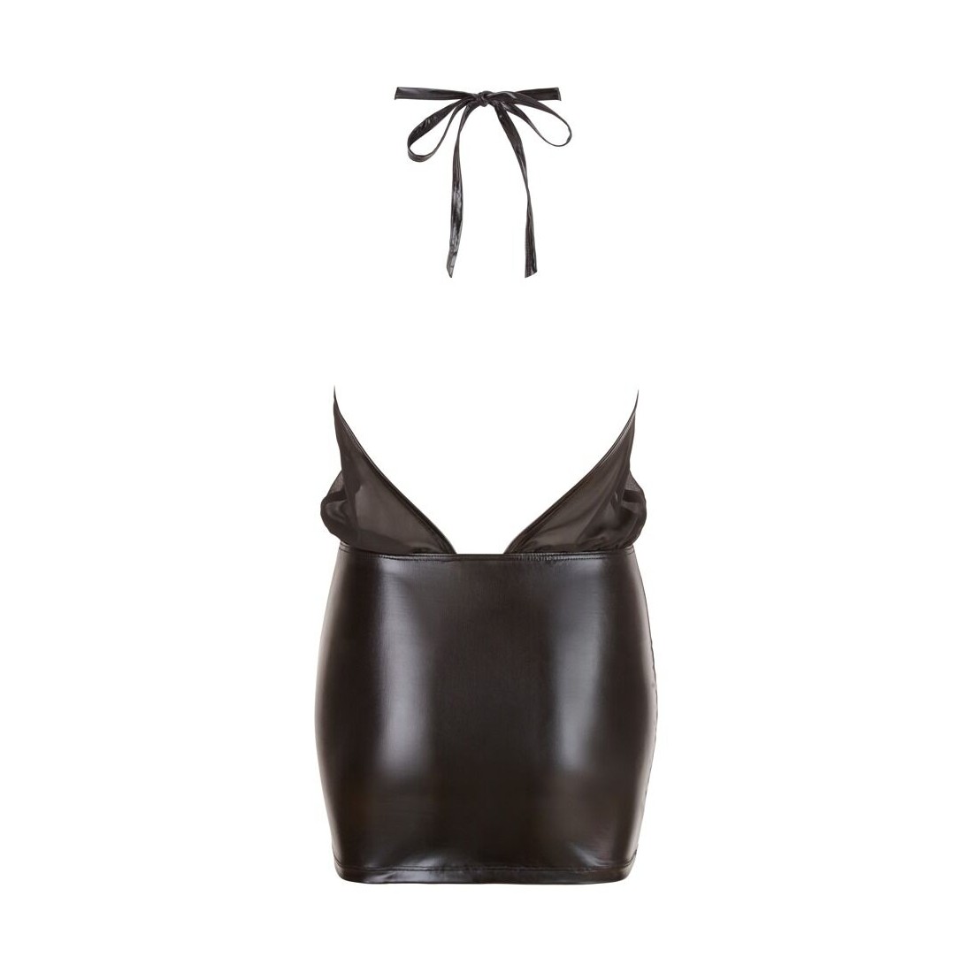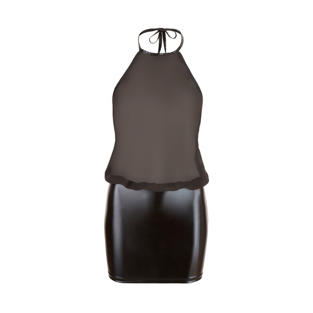 Questo miniabito nero con portacollo per la legatura è a collo alto davanti, ma dietro incanta con la schiena libera. La parte della gonna, realizzata in look lucido e bagnato, si adatta perfettamente, mentre il top in chiffon trasparente è tagliato un po' più largo. Che contrasto affascinante!