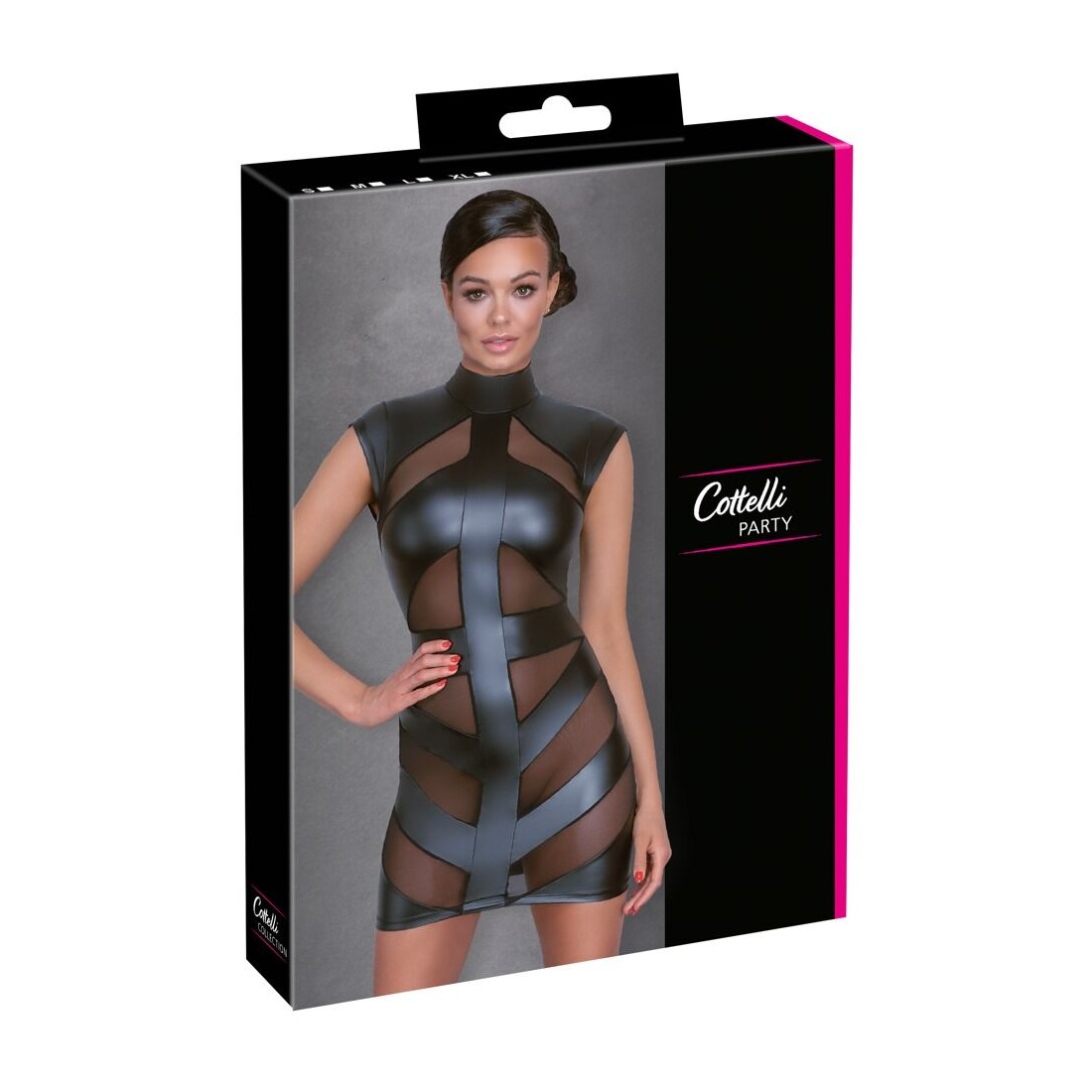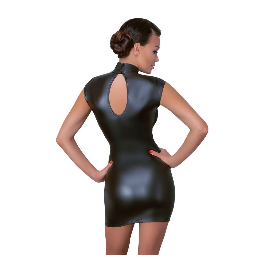 Abito corto in vita di Cottelli PARTY in look nero opaco con inserti in powernet trasparente sul davanti. Colletto in piedi con 2 bottoni nel collo, grande ritaglio ovale nella parte posteriore in basso. Morbido e altamente elastico per un elevato comfort di vestibilità.