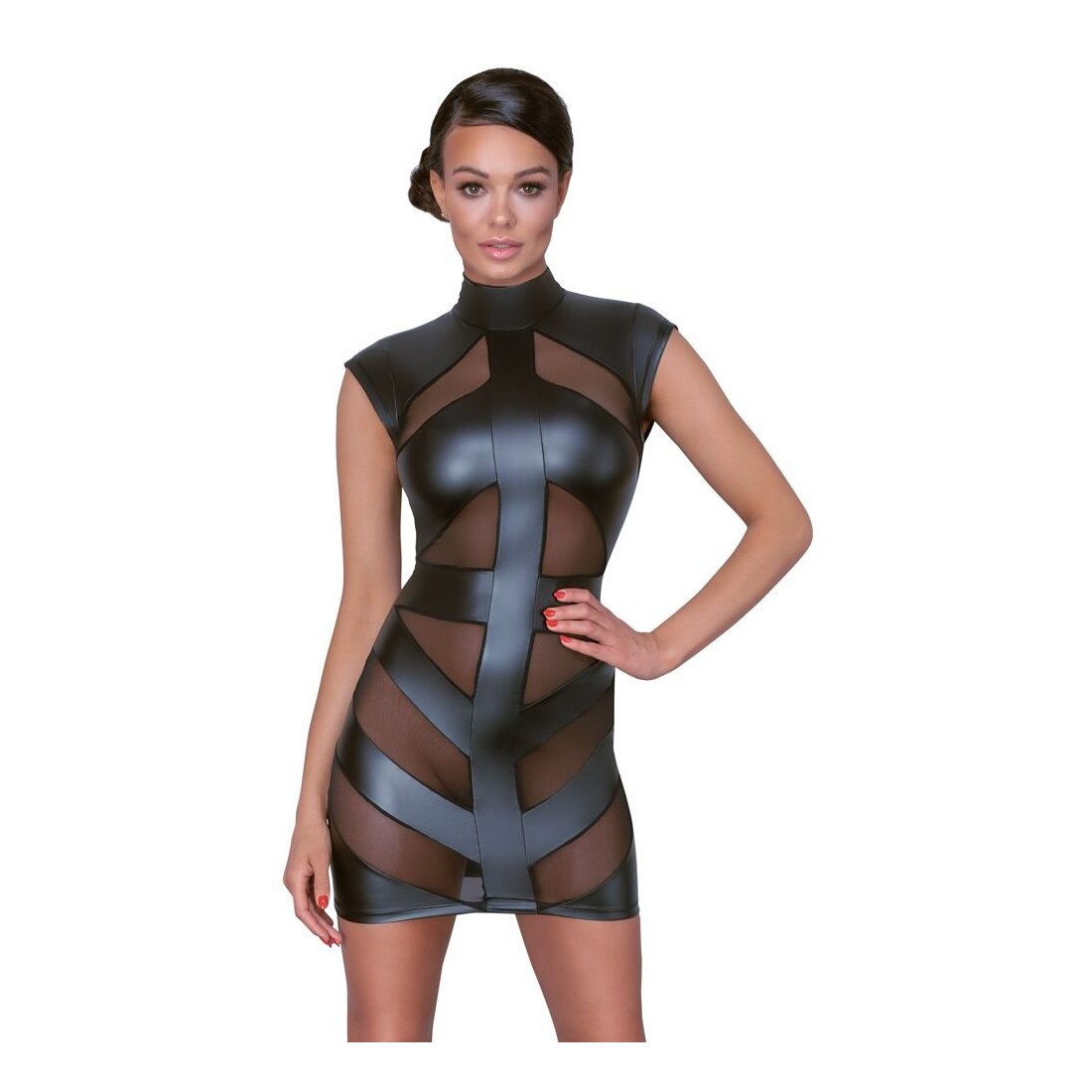 Abito corto in vita in look nero opaco con inserti in powernet trasparente sul davanti L
