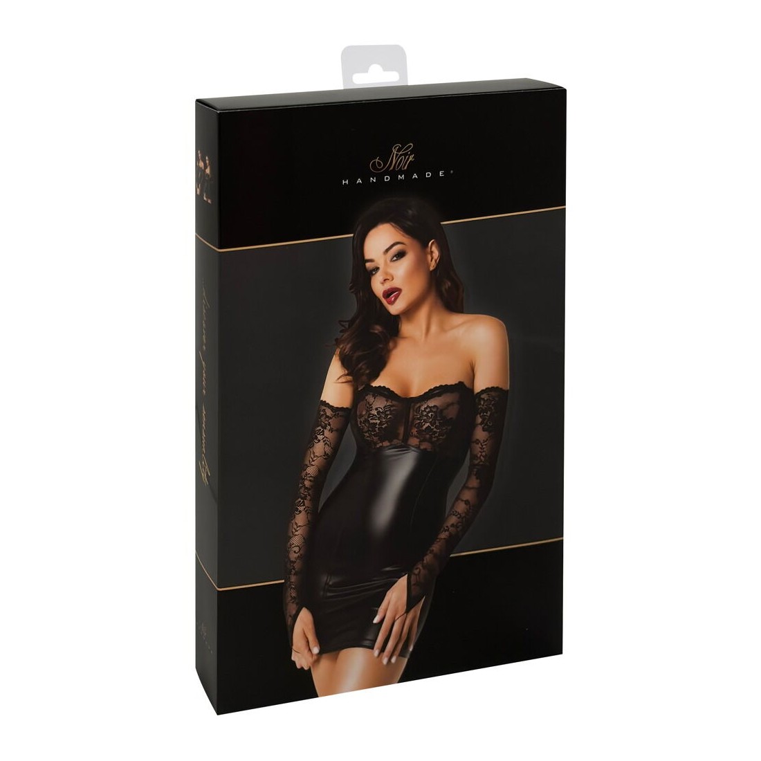 Miniabito a tubo aderente senza spalline di Noir in un elegante look powerwet nero con coppe in pizzo pregiato. Elasticizzato su tutto il corpo e morbido al tatto. Con cerniera sul retro. I polsini in pizzo elasticizzato con passanti per le dita sono inclusi!
