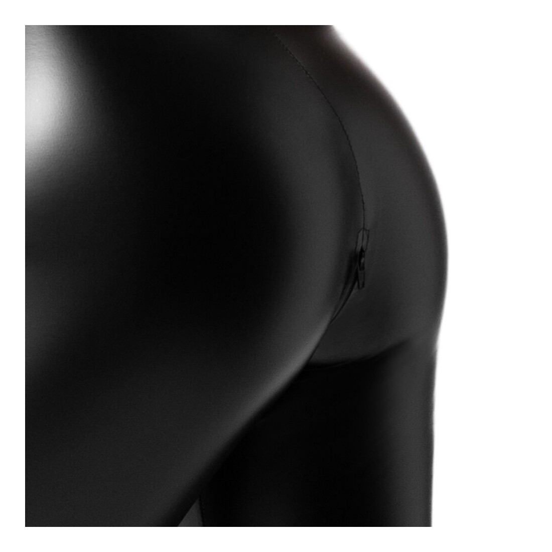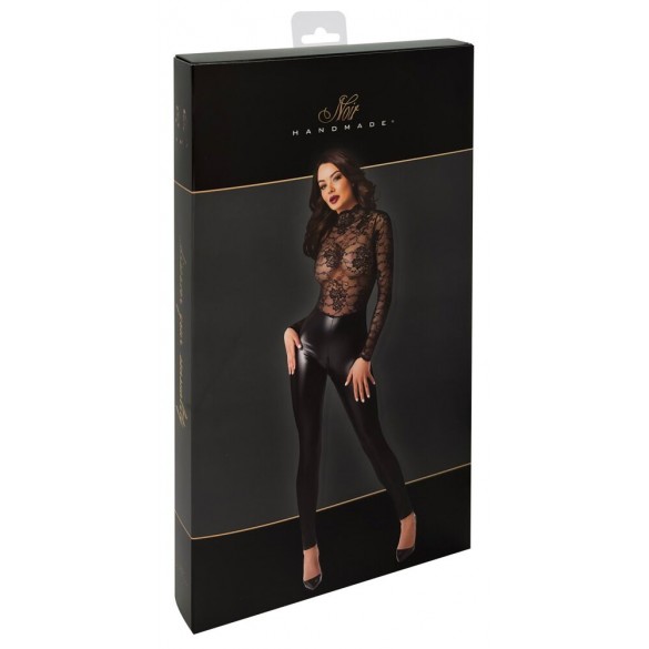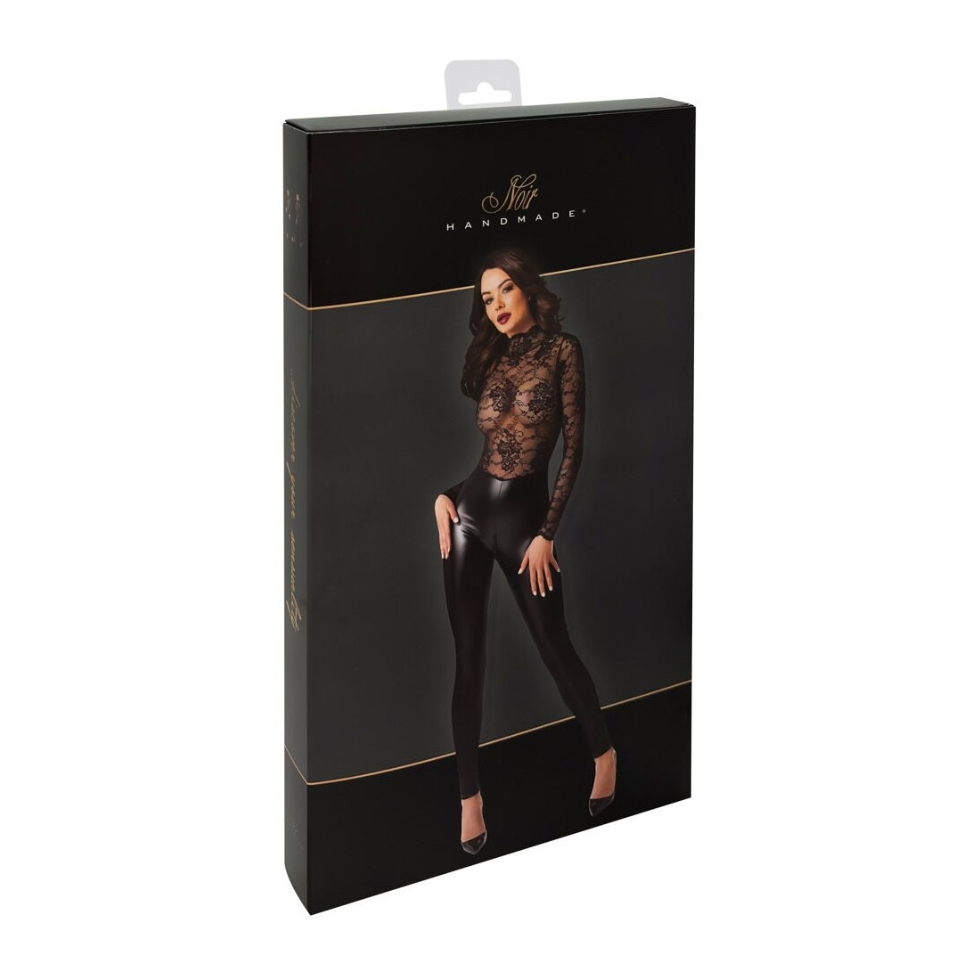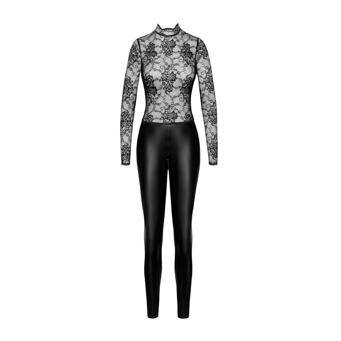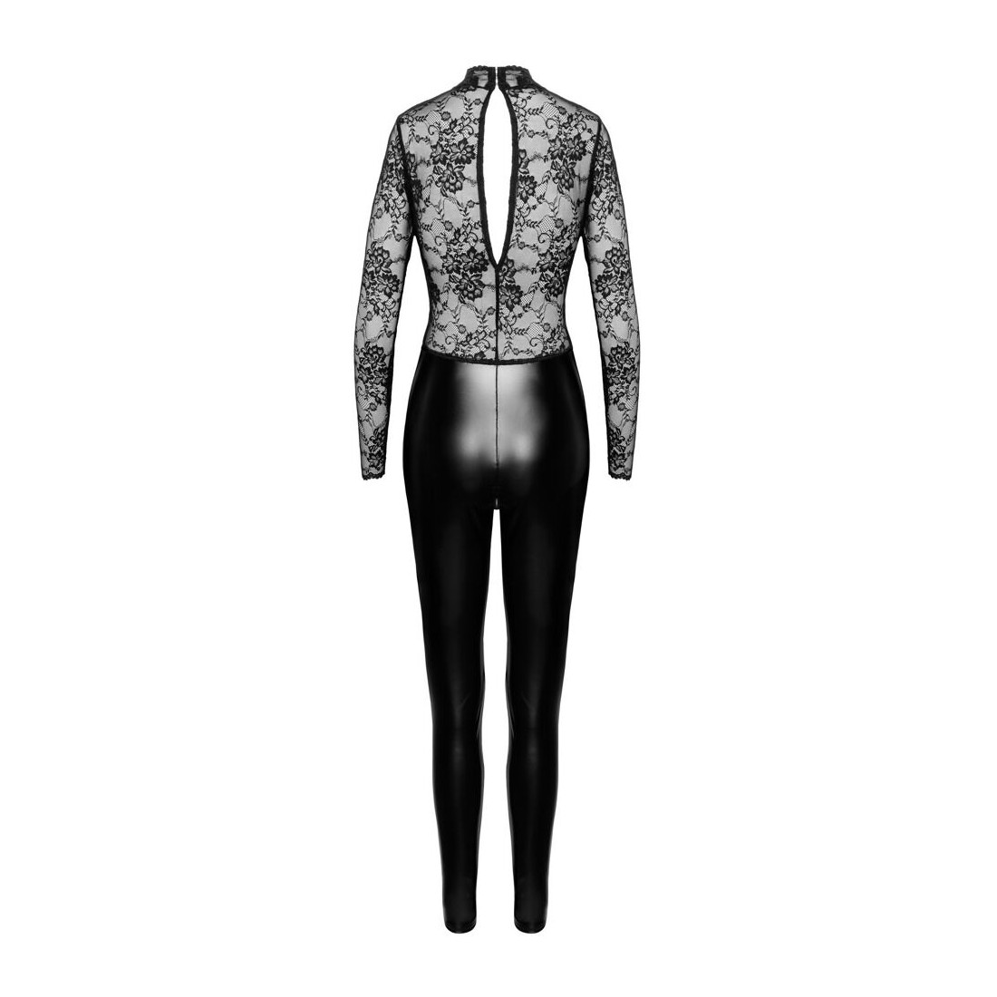 Tuta nera aderente a maniche lunghe di Noir realizzata in splendido pizzo (top) in un mix con powerwetlook - si adatta come una seconda pelle. Morbida ed elastica per un elevato livello di comfort. Spacco sul retro, collo alto con bottoni. Con cerniera sul cavallo: pratica e seducente allo stesso tempo.