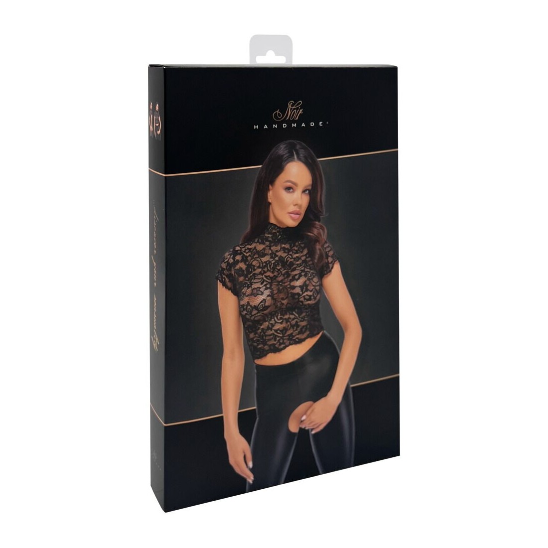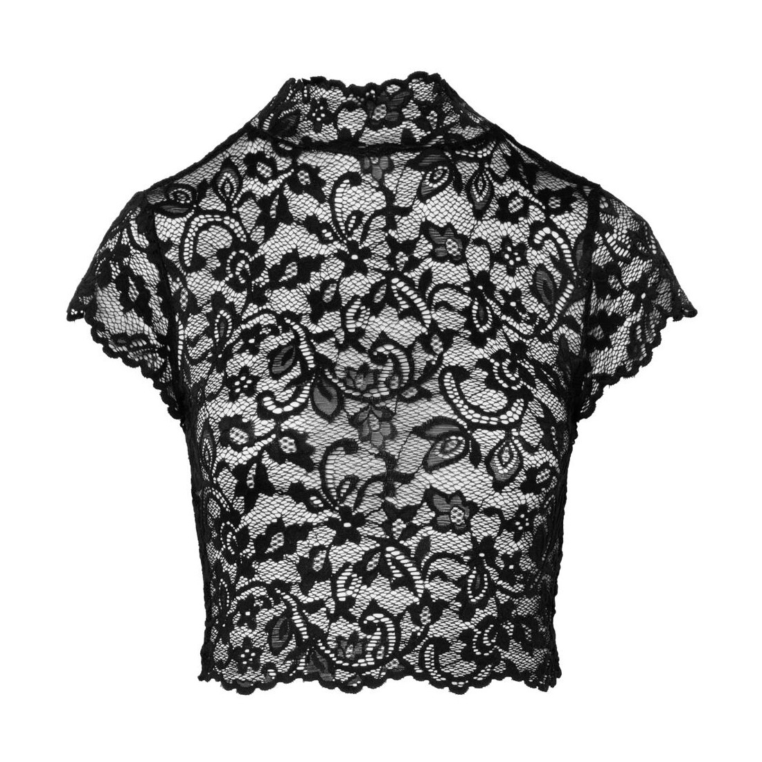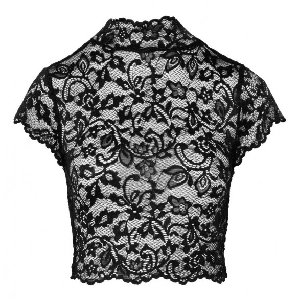 Crop top corto di Noir realizzato in splendido pizzo floreale nero. Morbido ed elasticizzato su tutto il corpo per un elevato livello di comfort. Collo alto e maniche corte. Spacco sul retro e chiusura a gancio sulla nuca.