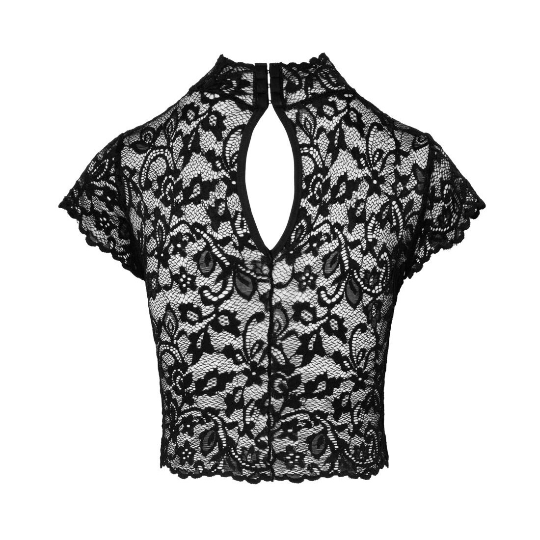 Crop top corto di Noir realizzato in splendido pizzo floreale nero. Morbido ed elasticizzato su tutto il corpo per un elevato livello di comfort. Collo alto e maniche corte. Spacco sul retro e chiusura a gancio sulla nuca.