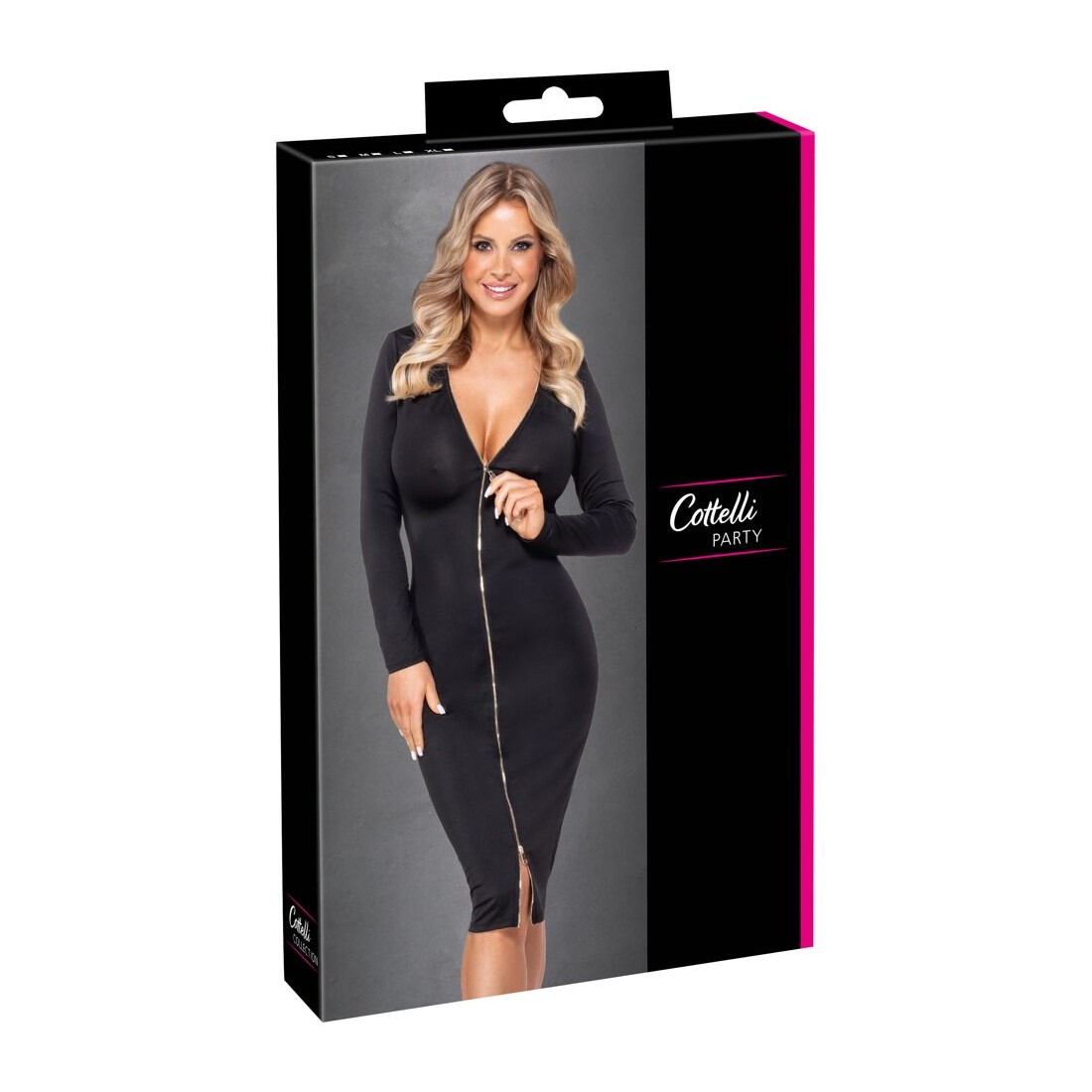 Abito nero a maniche lunghe di Cottelli PARTY con taglio aderente e lunghezza midi. Con una cerniera a due vie color oro sul davanti, che può essere aperta individualmente dall'alto e dal basso. Il materiale finemente elasticizzato è aderente e garantisce il massimo comfort di vestibilità e movimento.