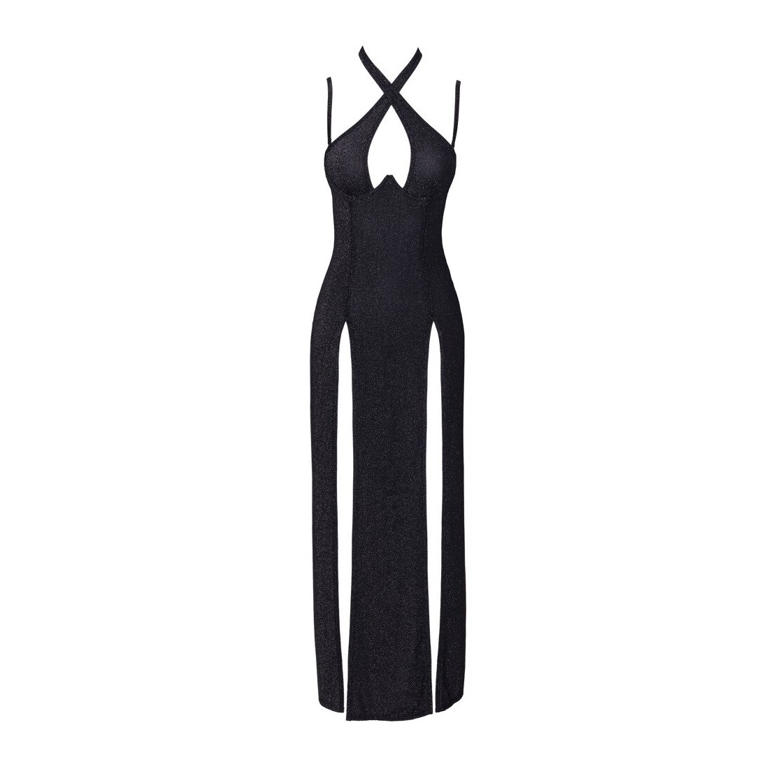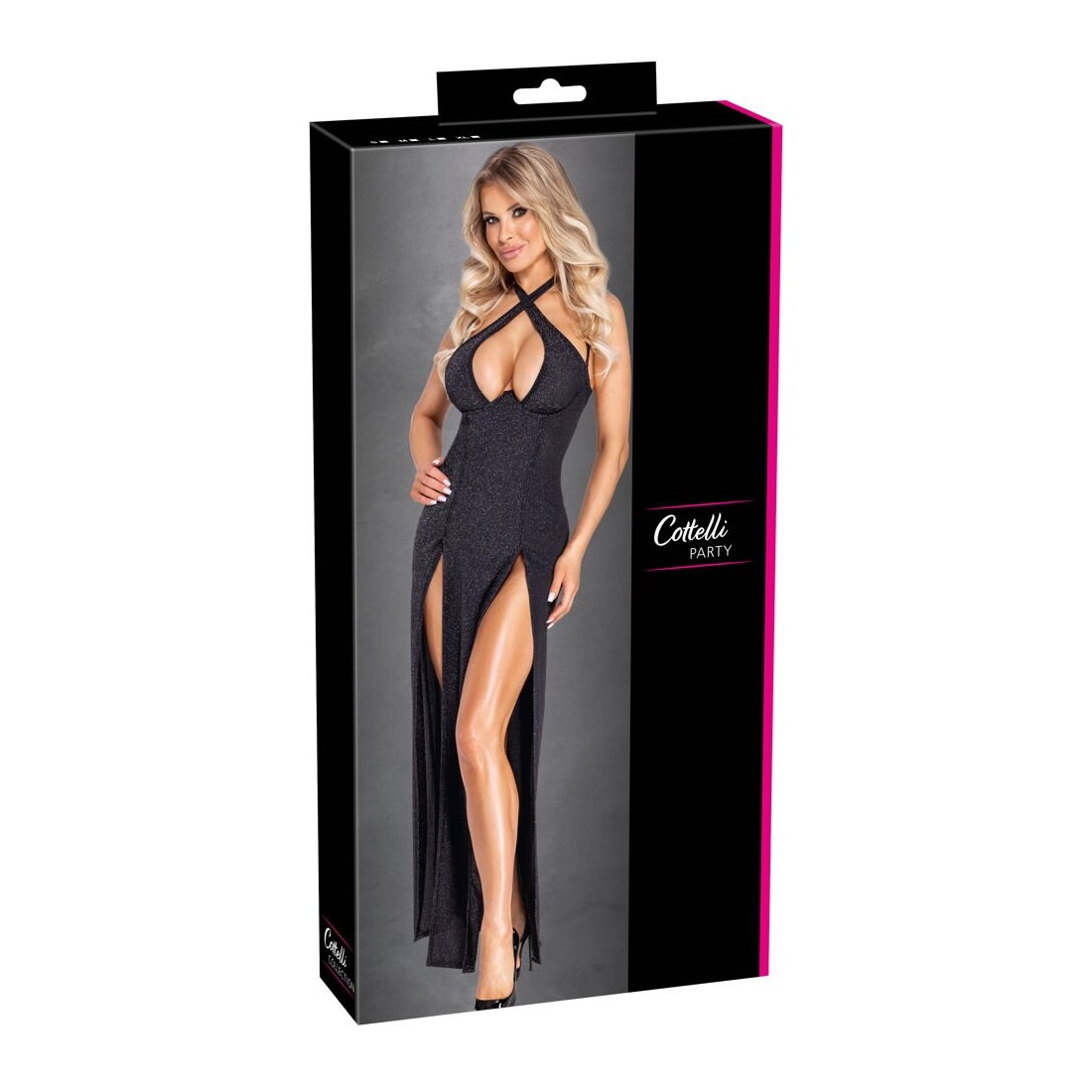 Elegante abito lungo di Cottelli PARTY in nero argento scintillante. Taglio aderente con coppe integrate con ferretto per un bel décolleté. Con un collo alto (chiusura a gancio) che può essere indossato anche incrociato sul davanti. Senza schiena e senza spalle - le spalline lucide aggiuntive e regolabili sono staccabili. La gonna lunga e aderente ha due alti spacchi sul davanti per una libertà di movimento ottimale e tanto sex appeal. Il materiale glitterato elasticizzato è morbido sulla pelle per un elevato livello di comfort.