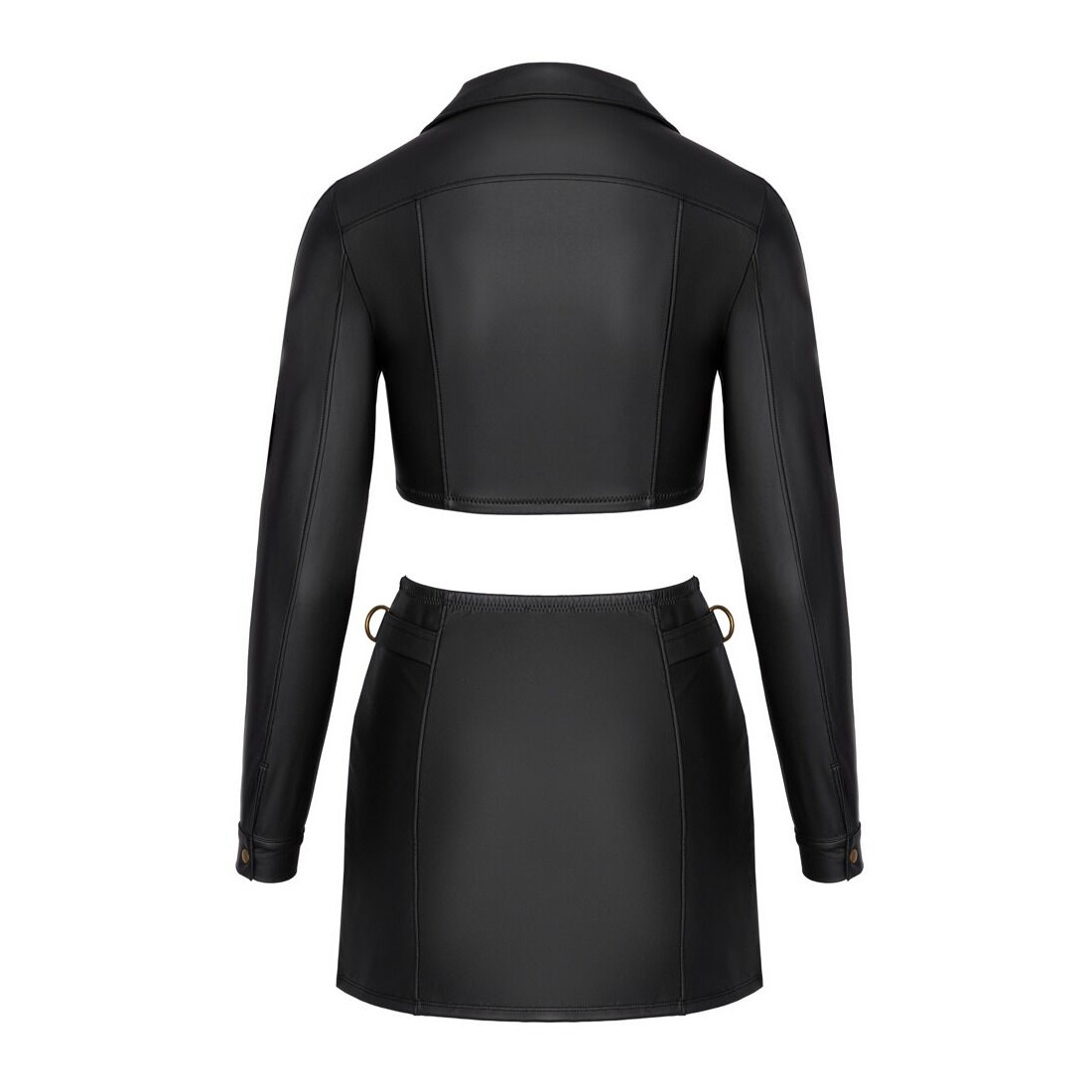 Set clubwear di Cottelli PARTY con top giacca corta e minigonna in look nero opaco con dettagli color ottone. Morbido ed elasticizzato su tutta la superficie per un elevato livello di comfort. Top giacca aderente e senza pancia con cerniera corta a tutta lunghezza sul davanti. Borchie decorative sul collo revers e bottoni a pressione sui polsini. La minigonna sottile è dotata di una cerniera a due vie a tutta lunghezza sul davanti e di anelli laterali sulla fascia elastica in vita.