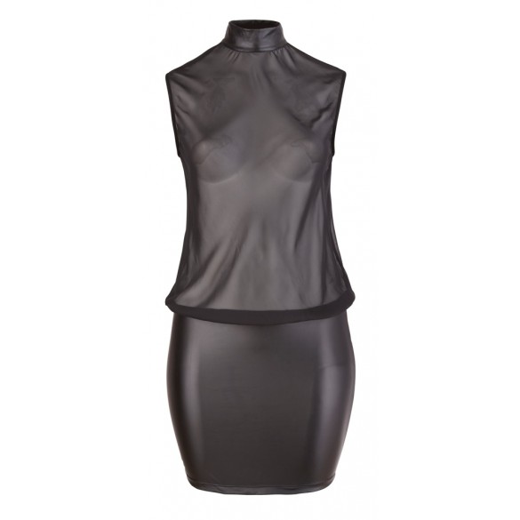 Questo mini abito nero è a cuore aperto e rivelatore allo stesso tempo, perché il top senza maniche in tessuto trasparente è tagliato molto largo e largo e lusinga le tue curve. Solo nella parte posteriore mostra la pelle nuda grazie alla scollatura. Al collo, un piccolo colletto rialzato con due bottoni arrotonda l'abito verso l'alto. La gonna opaca, lucida e coprente, invece, è aderente e quindi il contrasto perfetto con il top. Se non è una combinazione di successo!