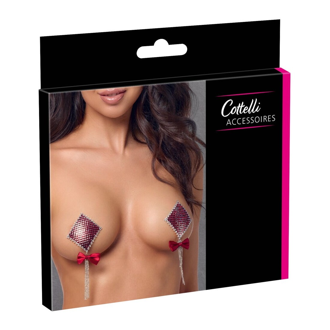Il fiocco per capezzoli di Cottelli ACCESSOIRES con un look elaborato. Un diamante di strass rossi luccicanti copre il capezzolo. Catene oscillanti e un fiocco di raso rosso forniscono ulteriori dettagli accattivanti. Da attaccare - può essere utilizzato più volte se la pellicola protettiva viene riapplicata per la conservazione.
