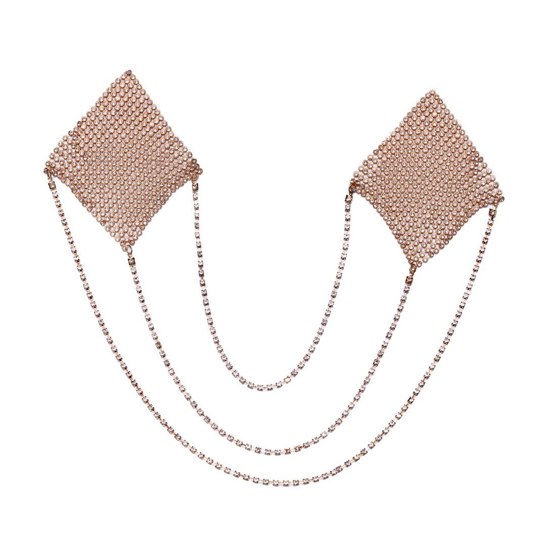 Adesivi per capezzoli quadrati color oro di Cottelli ACCESSOIRES a forma di diamanti scintillanti con tre sottili catene di collegamento oscillanti. Adesivi per capezzoli da attaccare - possono essere utilizzati più volte se la pellicola protettiva viene riapplicata per la conservazione.