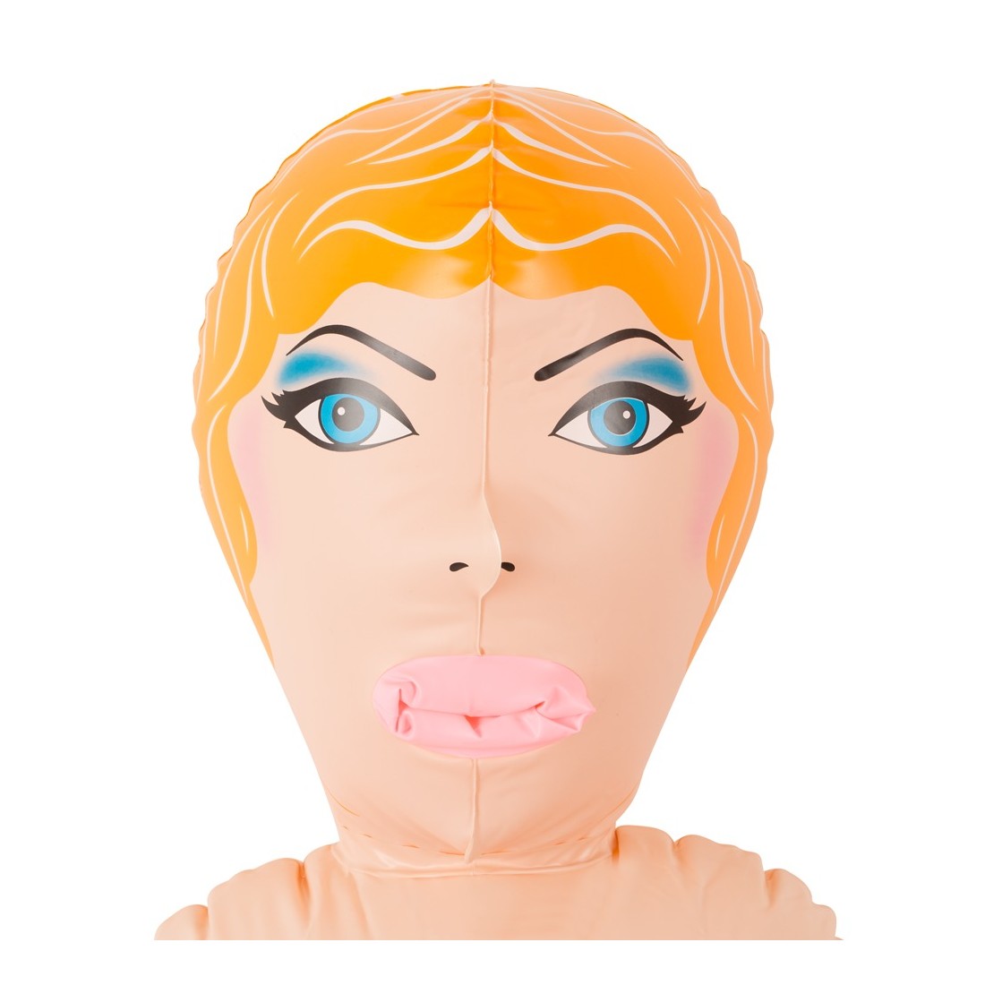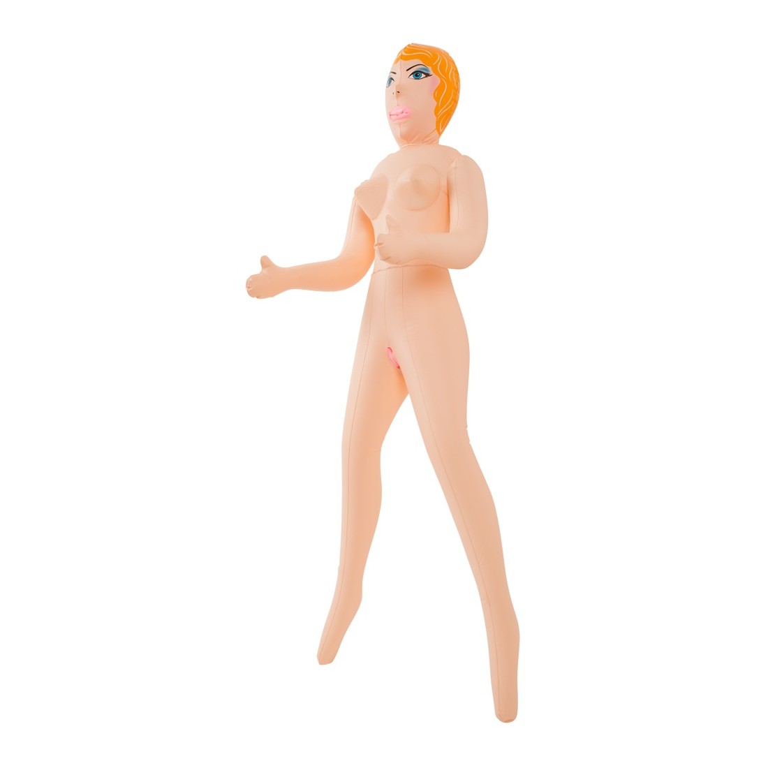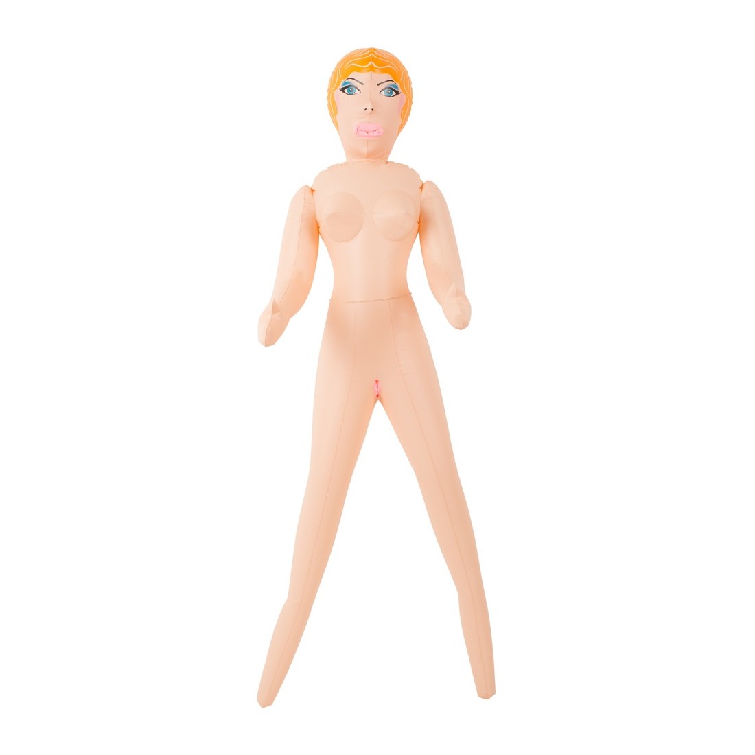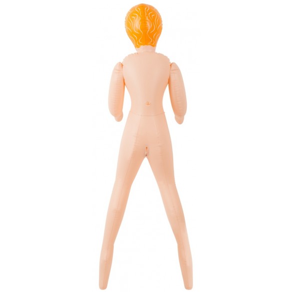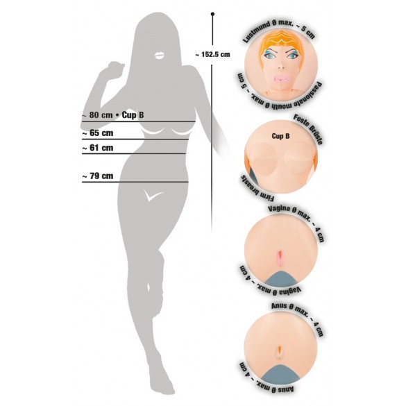 Bellezza bionda dalla pelle chiara con tre aperture del piacere (bocca, vagina, ano), viso e capelli sono stampati. Bambola gonfiabile ad altezza uomo. Materiale: PVC.