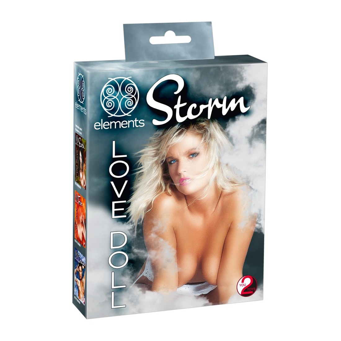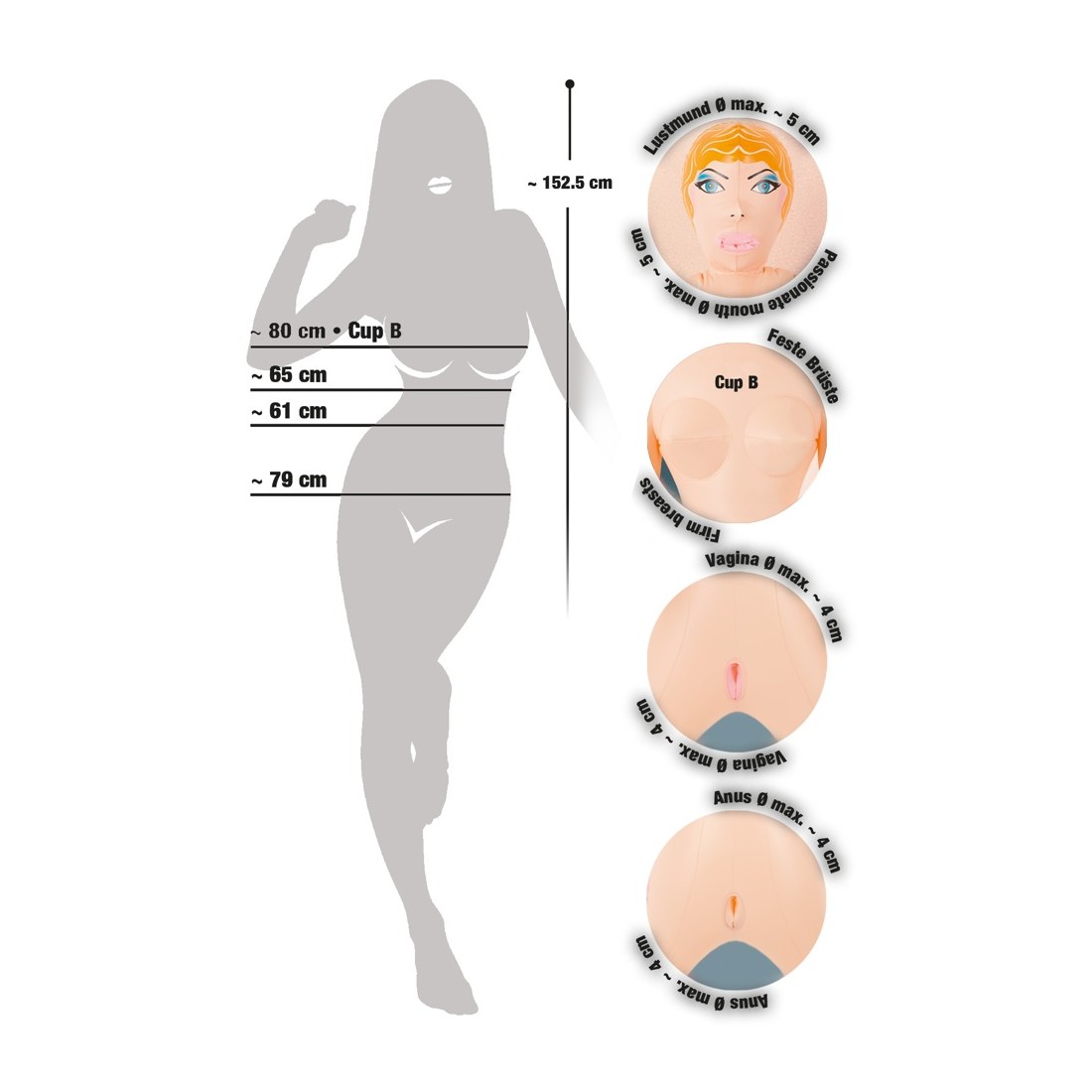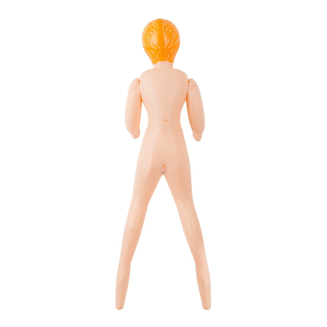 Bellezza bionda dalla pelle chiara con tre aperture del piacere (bocca, vagina, ano), viso e capelli sono stampati. Bambola gonfiabile ad altezza uomo. Materiale: PVC.