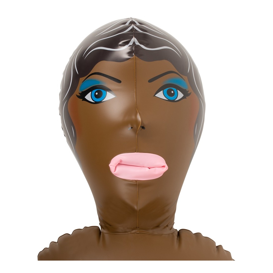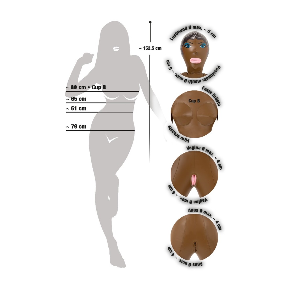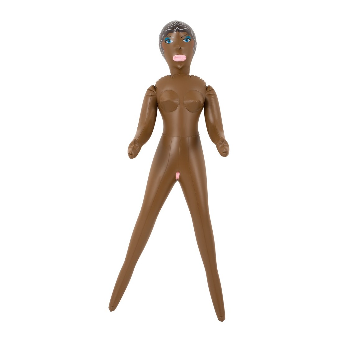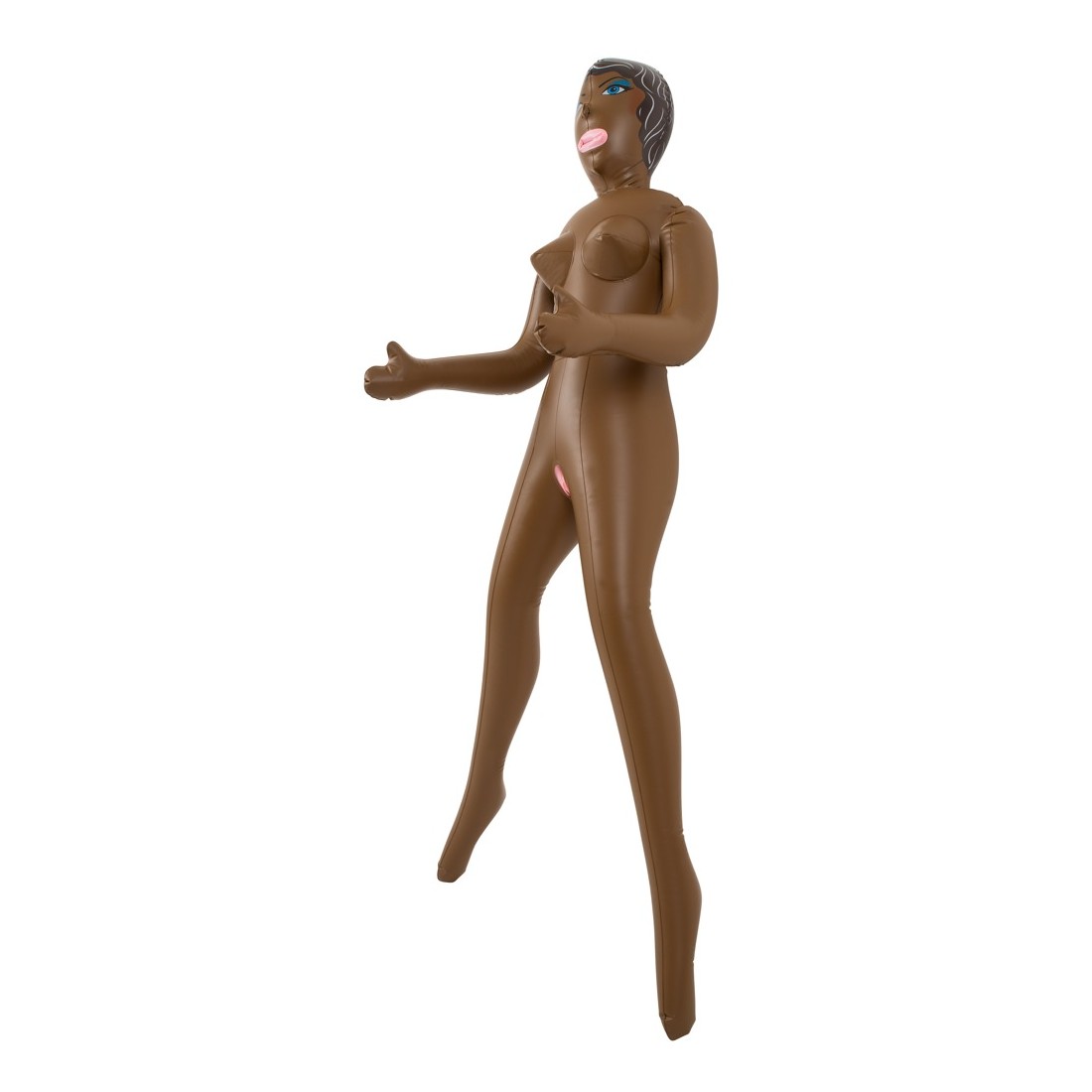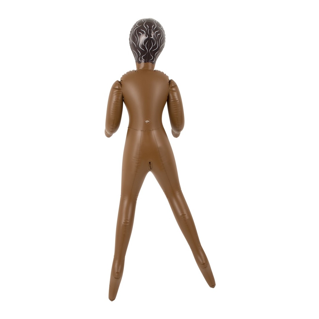 Latina bruna con tre aperture del piacere (bocca, vagina, ano), viso e capelli sono stampati. Bambola gonfiabile ad altezza uomo. Materiale: PVC.
