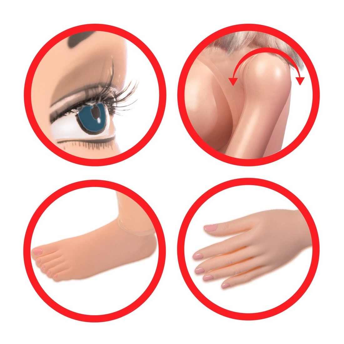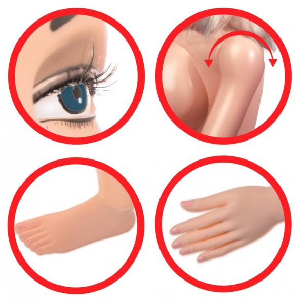 Questa bambola d'amore guarda lo spettatore sensualmente con il suo seducente viso 3D e i lunghi capelli biondi. Anche le mani e i piedi sono sagomati e vi invitano ad accarezzarli, mentre i seni vivaci con i capezzoli sodi affascinano. I due canali del piacere si trovano in un masturbatore che è rimovibile e facilita la pulizia. Il masturbatore è strutturato all'interno.