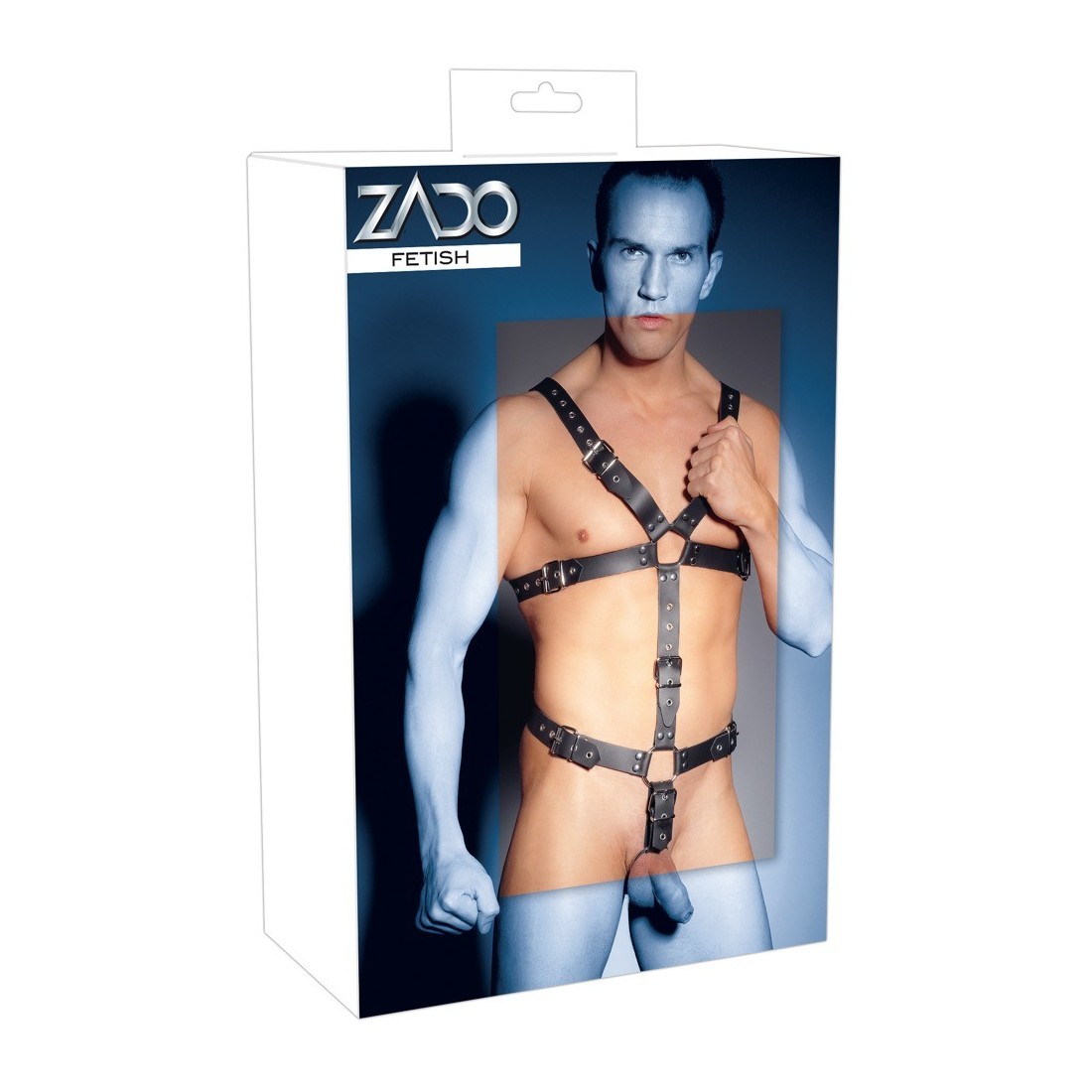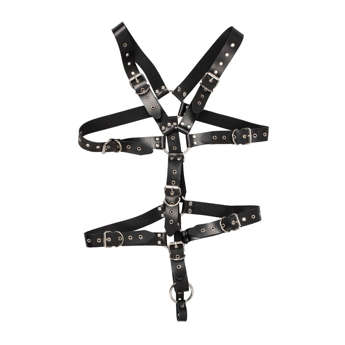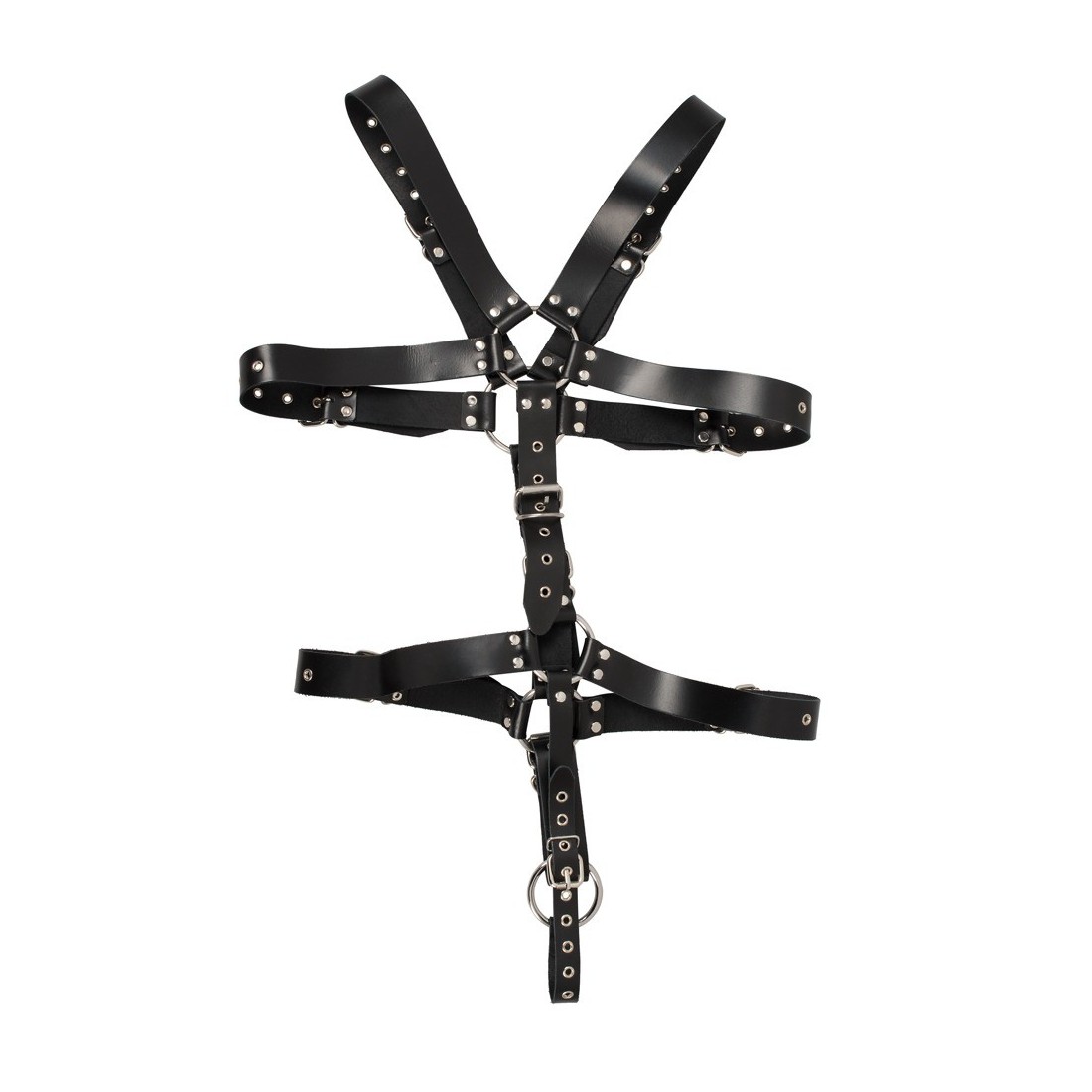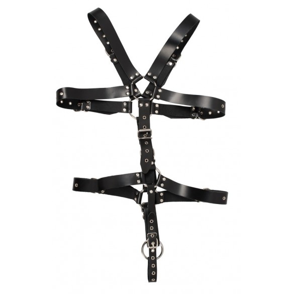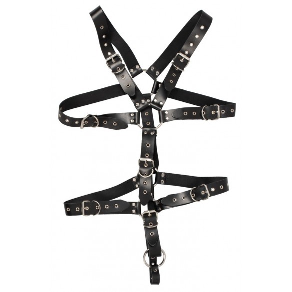 Imbracatura fatta di cinghie di cuoio nero, borchiate e anelli di collegamento in acciaio. Multipli regolabili con chiusure a fibbia per una vestibilità individuale. Un anello per il pene o il testicolo (Ø 5 cm) tiene inoltre sotto controllo LUI. Alta qualità, qualità durevole!