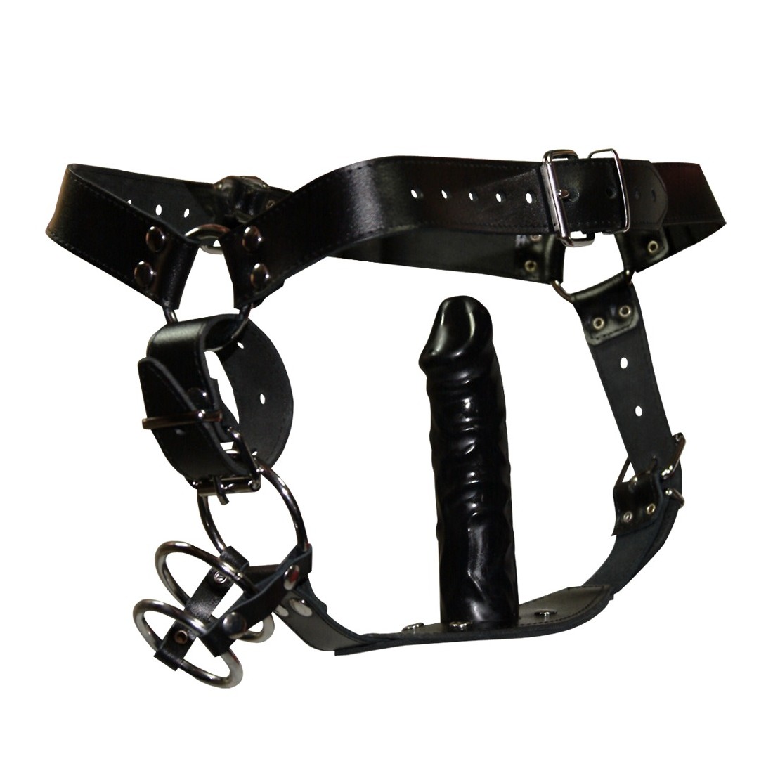 Perizoma unico per veri professionisti del fetish. Multiplo regolabile e dotato di 3 anelli per il pene e i testicoli, nonché di un sorprendente dildo venato in lattice.