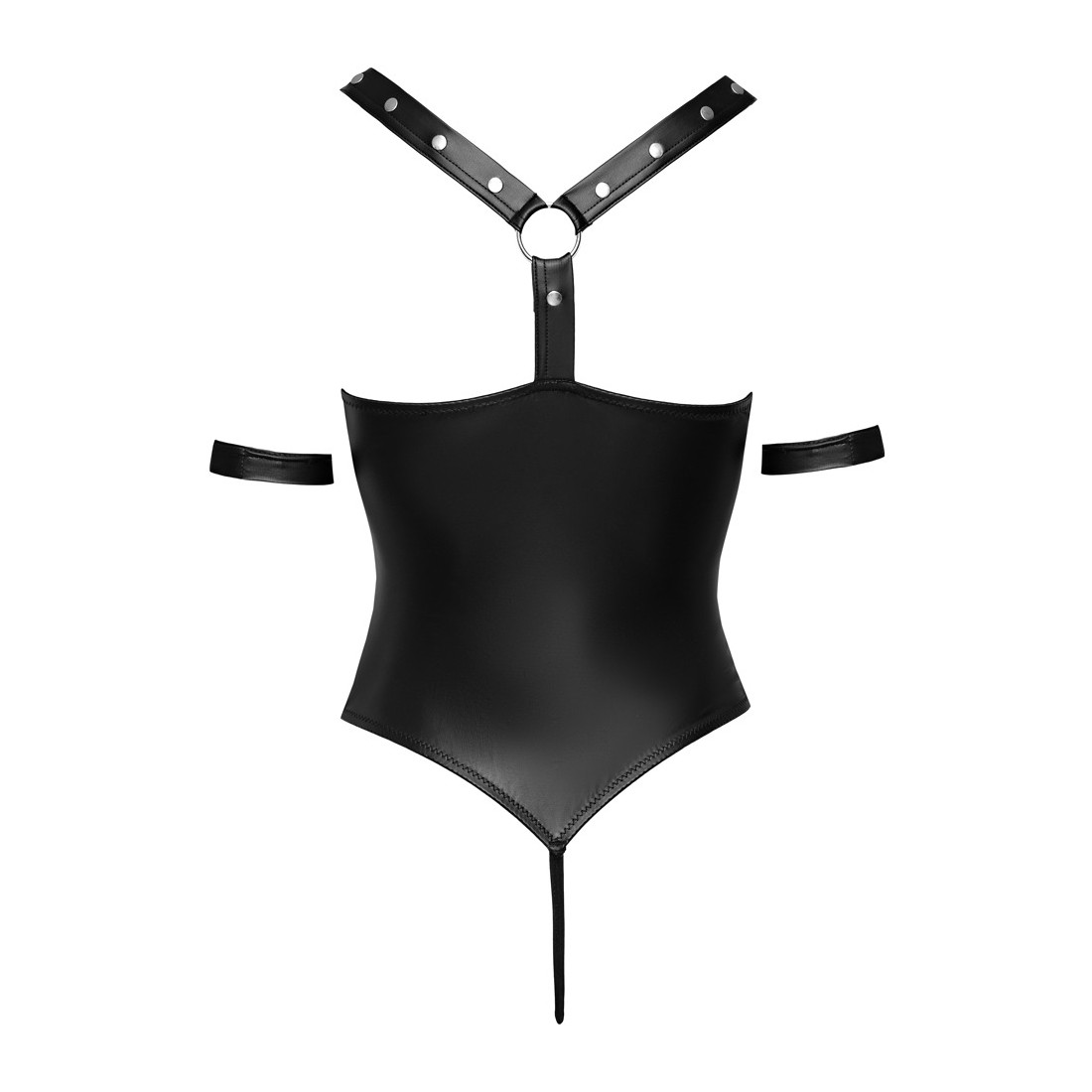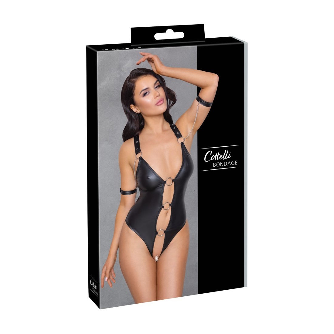 Ouvert string body di Cottelli BONDAGE in nobile look nero opaco con elementi in metallo color argento. Completamente aperto sul davanti - solo 3 grandi anelli decorativi tengono tutto insieme. Le spalline larghe, che si uniscono in un anello con una barra nella parte posteriore aperta, sono sofisticate. Le cinghie possono essere regolate con i bottoni a pressione per una vestibilità perfetta. Le due cavigliere chiuse (con chiusure in velcro) possono essere attaccate agli anelli delle cinghie con le catene a moschettone per fissaggi lussuriosi.