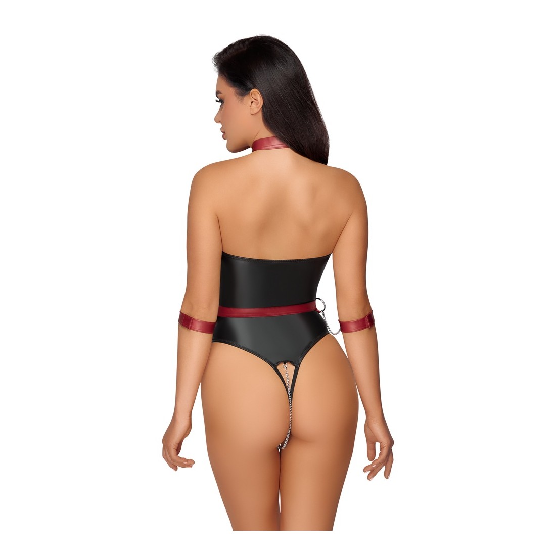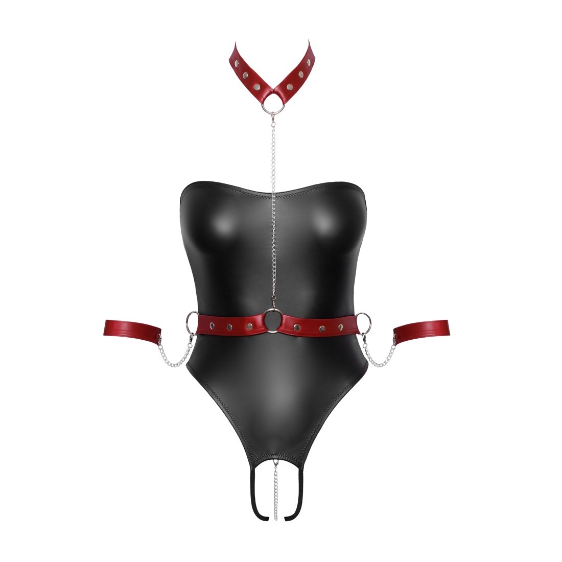Corpo di stringa off-the-shoulder crotchless di Cottelli BONDAGE in un nobile look nero opaco. Viene fornito con una pettorina staccabile in look rosso opaco con accessori in metallo color argento. Le catene a moschettone sono staccabili dall'imbracatura, in modo che il collare, la cintura e le manette possano essere indossati anche da soli. Il colletto e la cintura sono regolabili con bottoni a pressione, le manette con chiusure in velcro. Una catena stimolante passa attraverso il cavallo completamente aperto, che può anche essere rimosso.