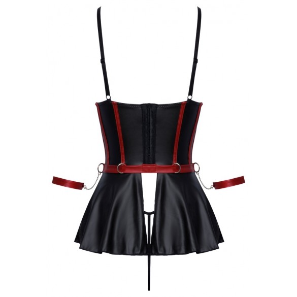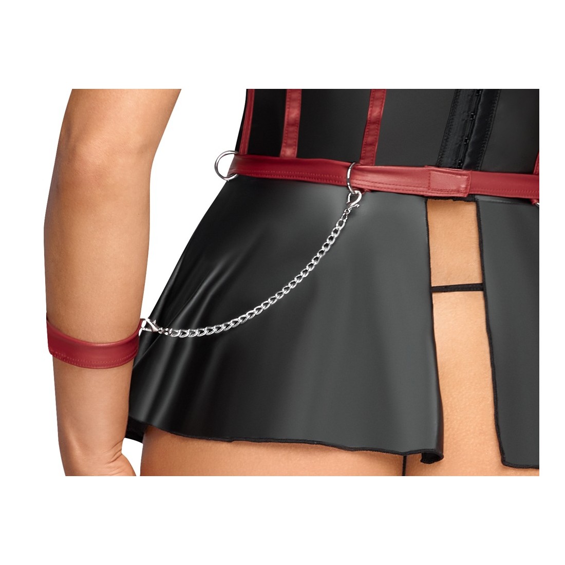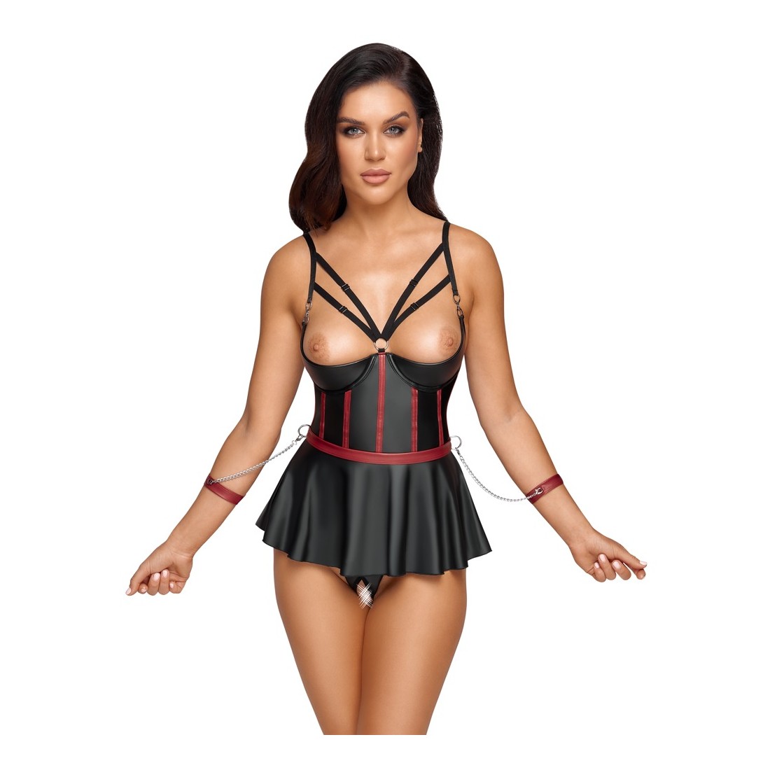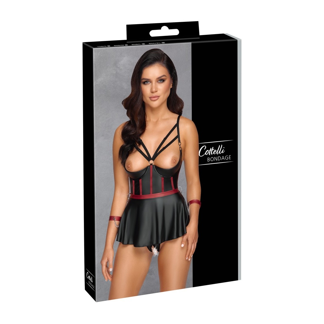 Reggiseno lungo e sollevabile con balza, perizoma senza cavallo e 2 polsini in un set di Cottelli BONDAGE. In un sofisticato look nero opaco con strisce rosse a contrasto in un corpetto che sottolinea la vita e dettagli color argento. Il reggiseno a linea lunga con le coppe con ferretto leggermente imbottite solleva perfettamente il seno e lo mette in risalto con le spalline elastiche. La balza della gonna svasata, aperta sul retro, gioca sensualmente attorno ai fianchi. Le spalline sul davanti sono decorate con gioielli decorativi che attirano ulteriormente l'attenzione. Le spalline, i nastri sullo scollo e la chiusura con gancio sul retro sono regolabili. In vita ci sono 4 anelli per i due polsini morbidi inclusi con le loro catenelle con moschettone. I polsini sono regolabili con chiusure a strappo. Il piccolo perizoma abbinato è piacevolmente aperto sul cavallo.