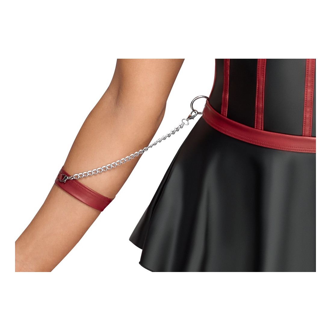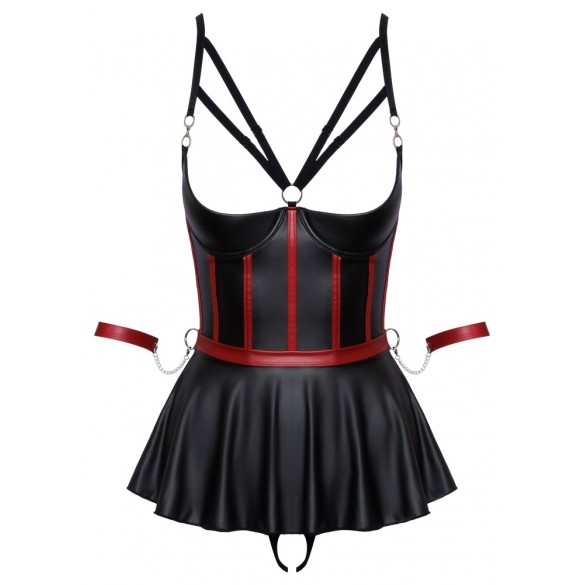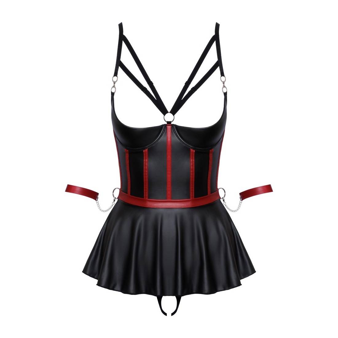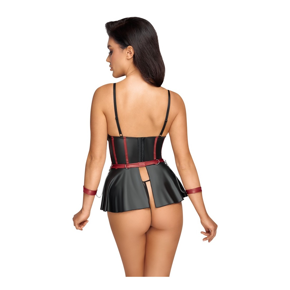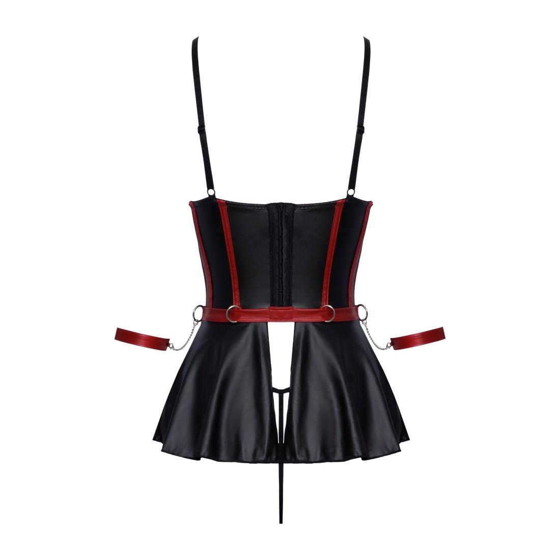 Reggiseno lungo e sollevabile con balza, perizoma senza cavallo e 2 polsini in un set di Cottelli BONDAGE. In un sofisticato look nero opaco con strisce rosse a contrasto in un corpetto che sottolinea la vita e dettagli color argento. Il reggiseno a linea lunga con le coppe con ferretto leggermente imbottite solleva perfettamente il seno e lo mette in risalto con le spalline elastiche. La balza della gonna svasata, aperta sul retro, gioca sensualmente attorno ai fianchi. Le spalline sul davanti sono decorate con gioielli decorativi che attirano ulteriormente l'attenzione. Le spalline, i nastri sullo scollo e la chiusura con gancio sul retro sono regolabili. In vita ci sono 4 anelli per i due polsini morbidi inclusi con le loro catenelle con moschettone. I polsini sono regolabili con chiusure a strappo. Il piccolo perizoma abbinato è piacevolmente aperto sul cavallo.
