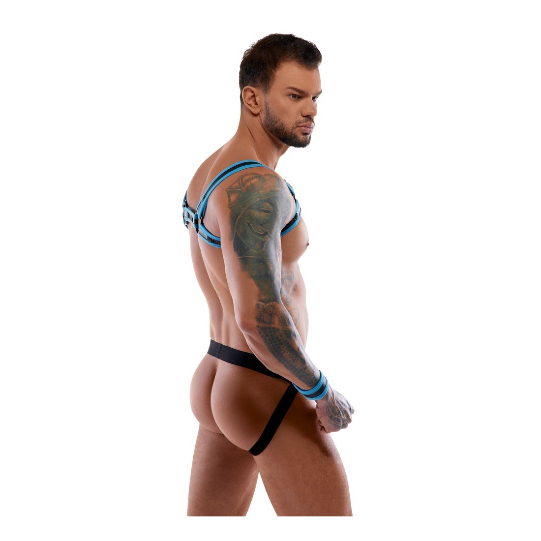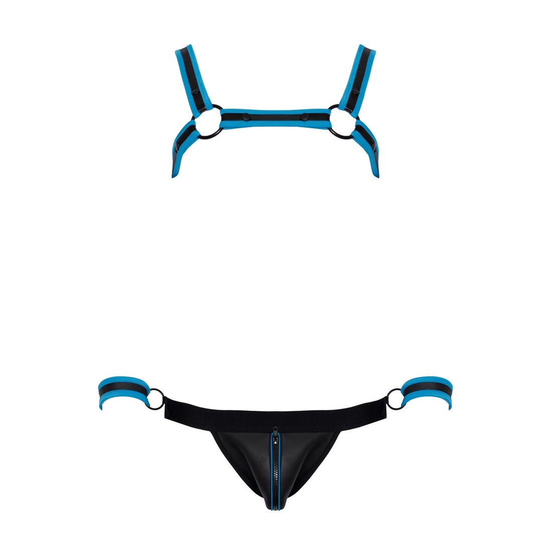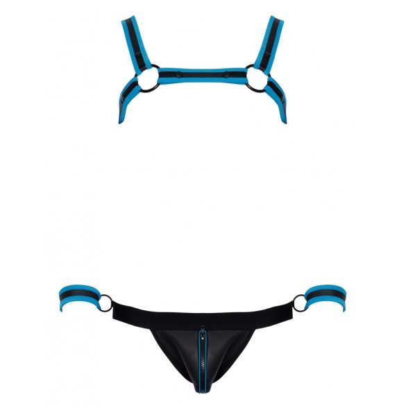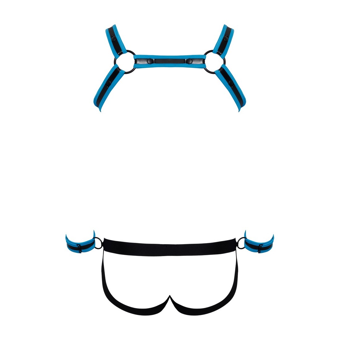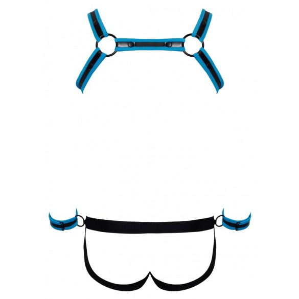 Pettorina, atleta e 2 manette in un set di Svenjoyment BONDAGE. Look stravagante in neoprene in nero con accenti blu reale. L'imbracatura può essere indossata e tolta rapidamente grazie ai bottoni a pressione. Il sospensorio con cerniera nella parte inferiore della custodia ha un invitante design aperto nella parte inferiore. La cintura ha un anello su ciascun lato per i polsini inclusi con chiusure a strappo regolabili.