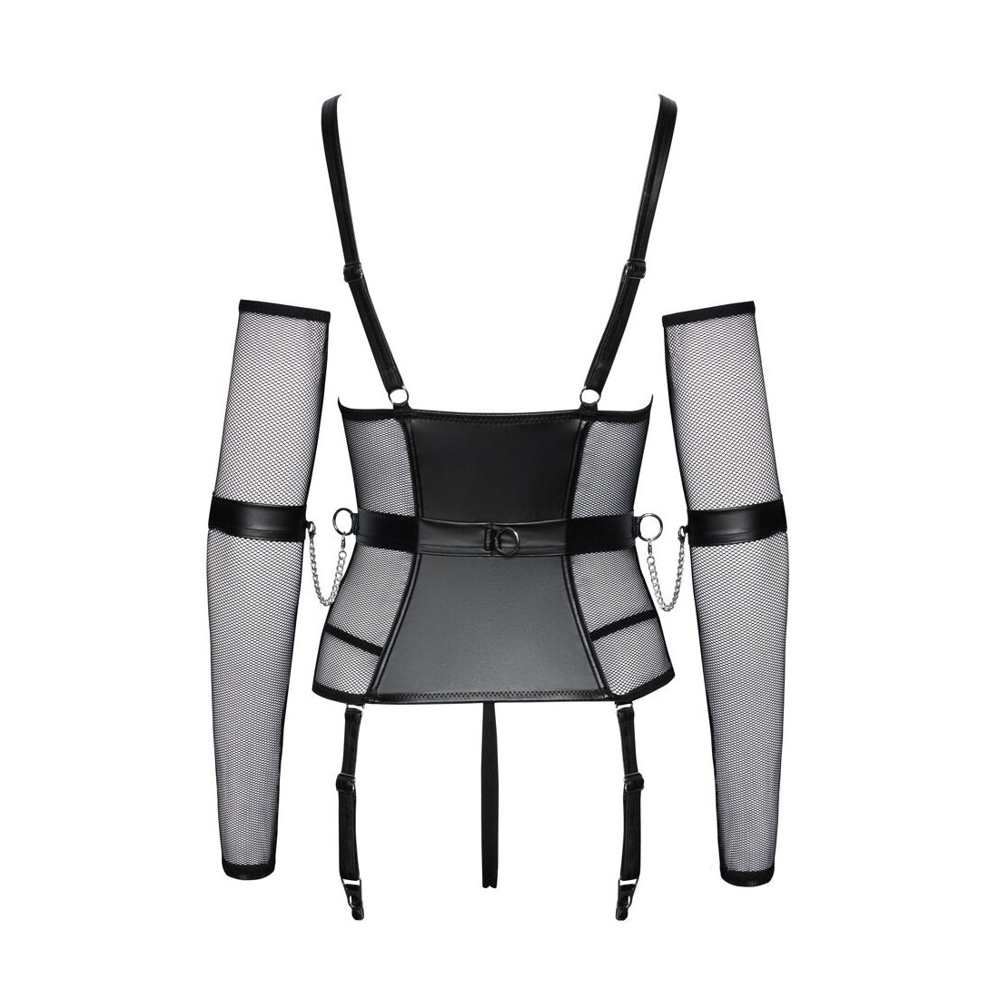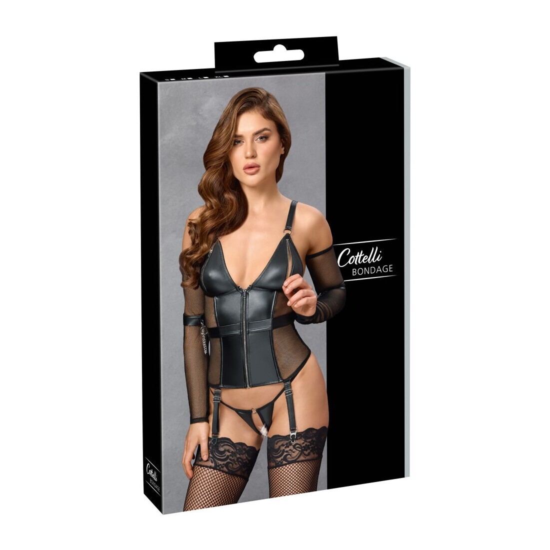 Set di lingerie Cottelli BONDAGE con camicia con reggicalze, perizoma inguinale, scaldabraccia e polsini. Mix di materiali eleganti ed elasticizzati in look opaco con rete e accessori color argento. Reggicalze con cerniera a tutta lunghezza sul davanti e cerniere nelle coppe sagomate. Con ossa sagomate per una vestibilità perfetta. Le spalline larghe possono essere regolate per adattarsi. Sul lato della cintura e sul retro è presente un anello per agganciare i polsini delle braccia con catene a moschettone. Le cavigliere possono essere indossate rapidamente con le loro chiusure in velcro e regolate per adattarsi. Le bretelle regolabili sono completamente rimovibili. Gli scaldabraccia lunghi e morbidi in rete e la stringa inguinale in look opaco completano l'accattivante completo.