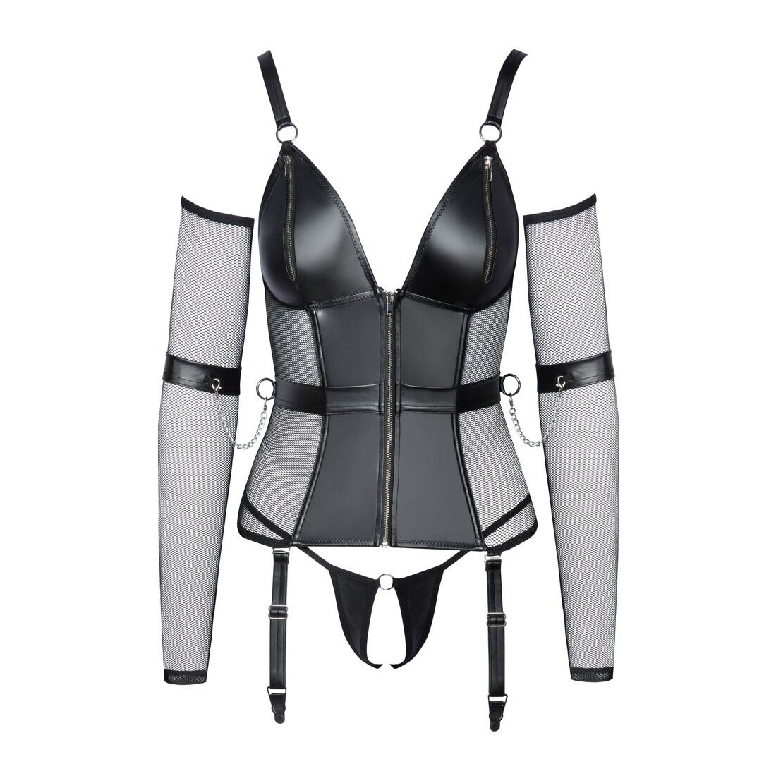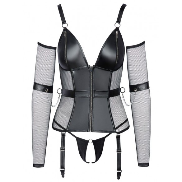 Set di lingerie Cottelli BONDAGE con camicia con reggicalze, perizoma inguinale, scaldabraccia e polsini. Mix di materiali eleganti ed elasticizzati in look opaco con rete e accessori color argento. Reggicalze con cerniera a tutta lunghezza sul davanti e cerniere nelle coppe sagomate. Con ossa sagomate per una vestibilità perfetta. Le spalline larghe possono essere regolate per adattarsi. Sul lato della cintura e sul retro è presente un anello per agganciare i polsini delle braccia con catene a moschettone. Le cavigliere possono essere indossate rapidamente con le loro chiusure in velcro e regolate per adattarsi. Le bretelle regolabili sono completamente rimovibili. Gli scaldabraccia lunghi e morbidi in rete e la stringa inguinale in look opaco completano l'accattivante completo.