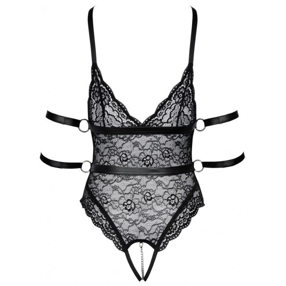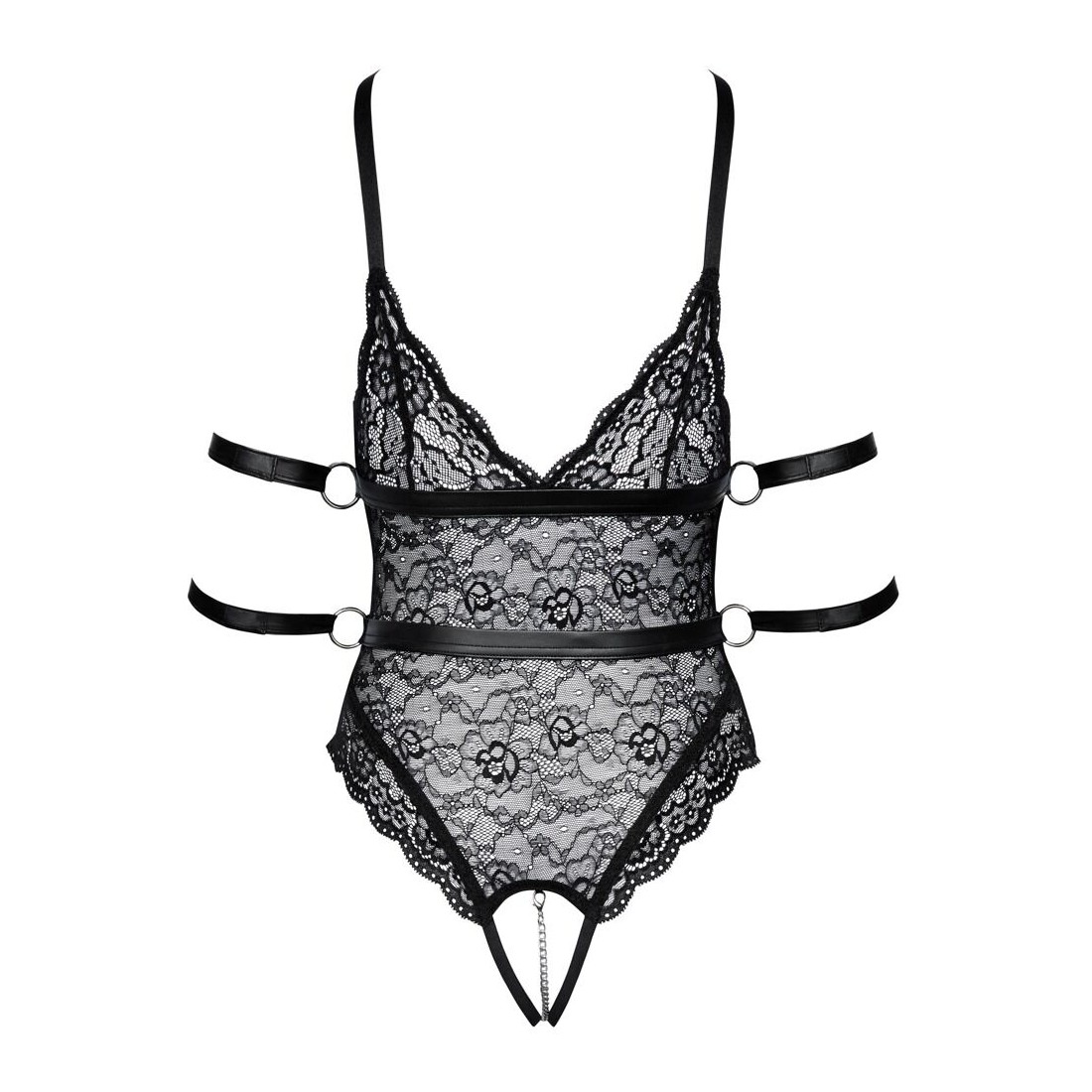 Body oversize in pizzo di Cottelli BONDAGE con 2 bretelle rimovibili e 4 cinturini alla caviglia. Realizzato in morbido pizzo nero elasticizzato con dettagli di cinghie dall'aspetto opaco e accessori color argento. Scollato davanti e dietro. Coppe morbide con spacchi seducenti. Catena stimolante rimovibile nel cavallo completamente aperto. Cinghie di cintura cucite sotto il seno e in vita, con anelli laterali attraverso i quali si possono tirare i 4 polsini alla caviglia. Le morbide cavigliere possono essere indossate e tolte rapidamente grazie a chiusure in velcro. Le due bretelle sono regolabili e completamente rimovibili.