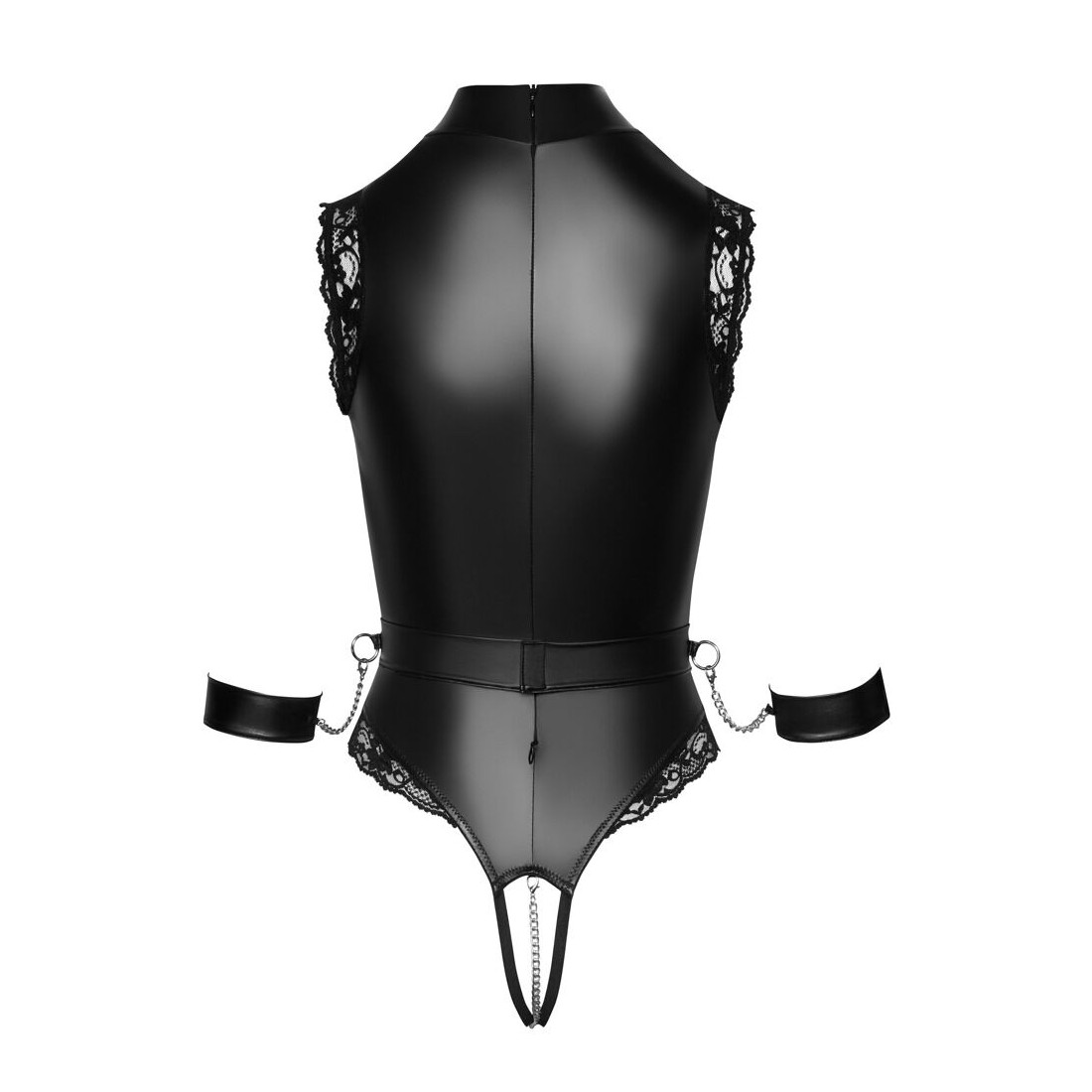 Body inguinale senza maniche di Cottelli BONDAGE con cintura rimovibile alla caviglia. In look nero, elasticizzato, morbido e opaco, con decorazioni in pizzo sulle aperture delle braccia e delle gambe e accessori color argento. Collo alto, con anello bondage sul davanti del colletto. Eccitante senza busto (cut-out) e con una catena stimolante rimovibile nel cavallo aperto. Con una lunga cerniera a 2 vie accuratamente integrata nella parte posteriore. I polsini per le braccia con catene a moschettone possono essere agganciati alla cintura in vita con anelli bondage. La cintura e le morbide cavigliere possono essere indossate e tolte rapidamente grazie alle loro chiusure in velcro regolabili.