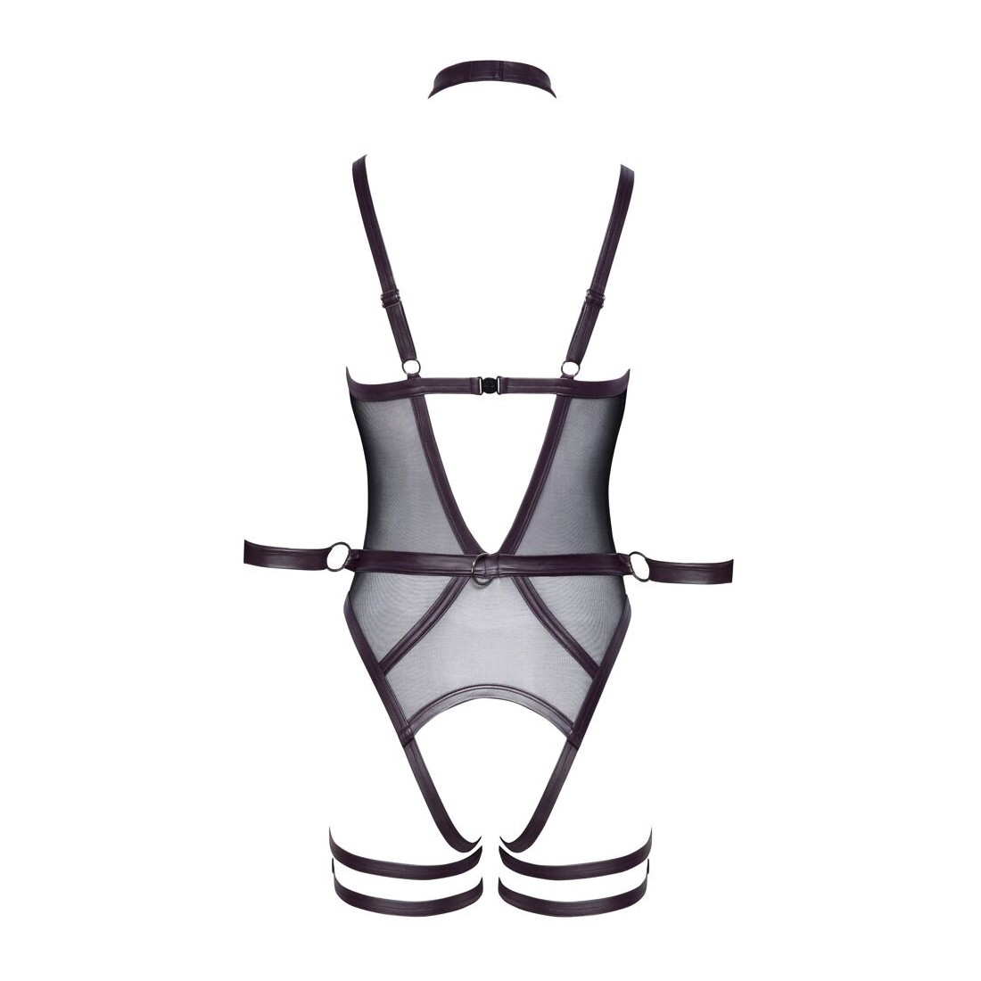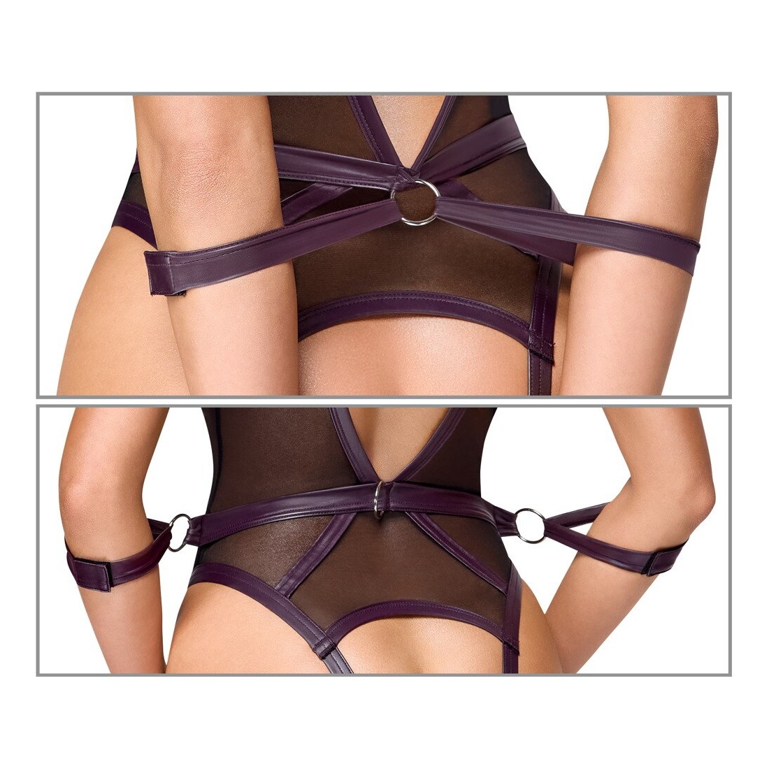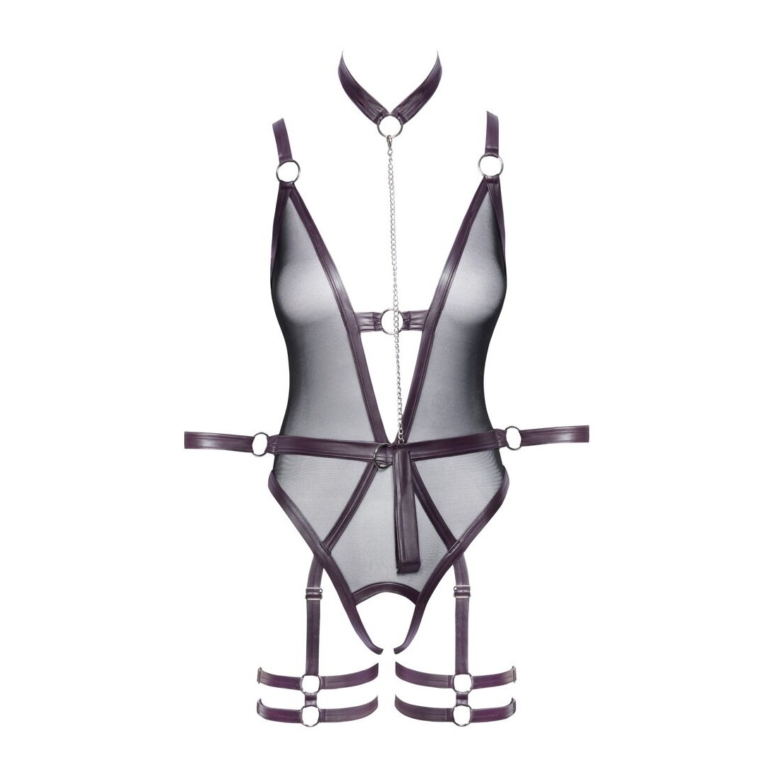 Corpo inguinale Cottelli BONDAGE con reggicalze e bretelle rimovibili. Sono inclusi anche un collare con guinzaglio a catena e due polsiere per giochi soft bondage! Corpo in powernet nero con dettagli decorativi in viola scuro opaco e accessori color argento. Scollato davanti e dietro e seducentemente aperto sul cavallo. Chiusura con gancio sul retro e spalline regolabili. La fascia in vita è dotata di anelli per i due polsini delle braccia. Le cavigliere possono essere indossate rapidamente con le loro chiusure in velcro e regolate a piacere. Così come il collare chiuso con la catena a moschettone staccabile come guinzaglio di guida. Anche le bretelle regolabili e le doppie cinghie per le cosce sono completamente rimovibili.