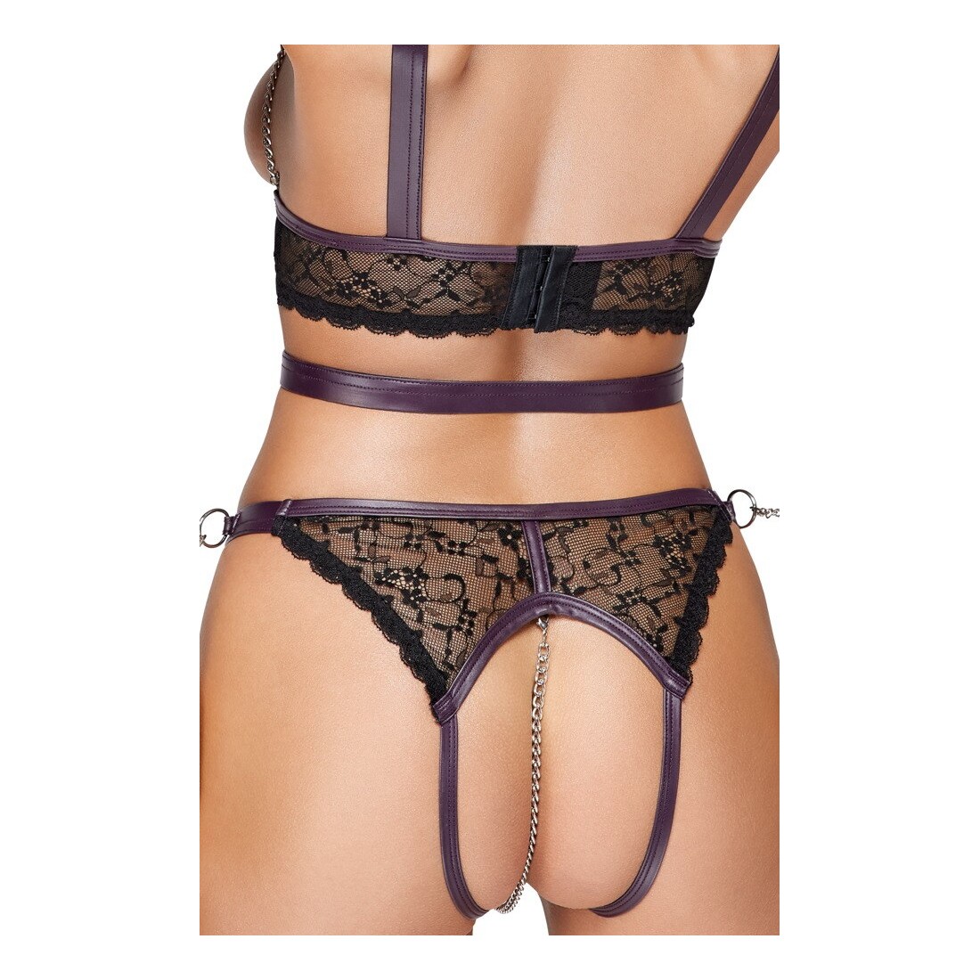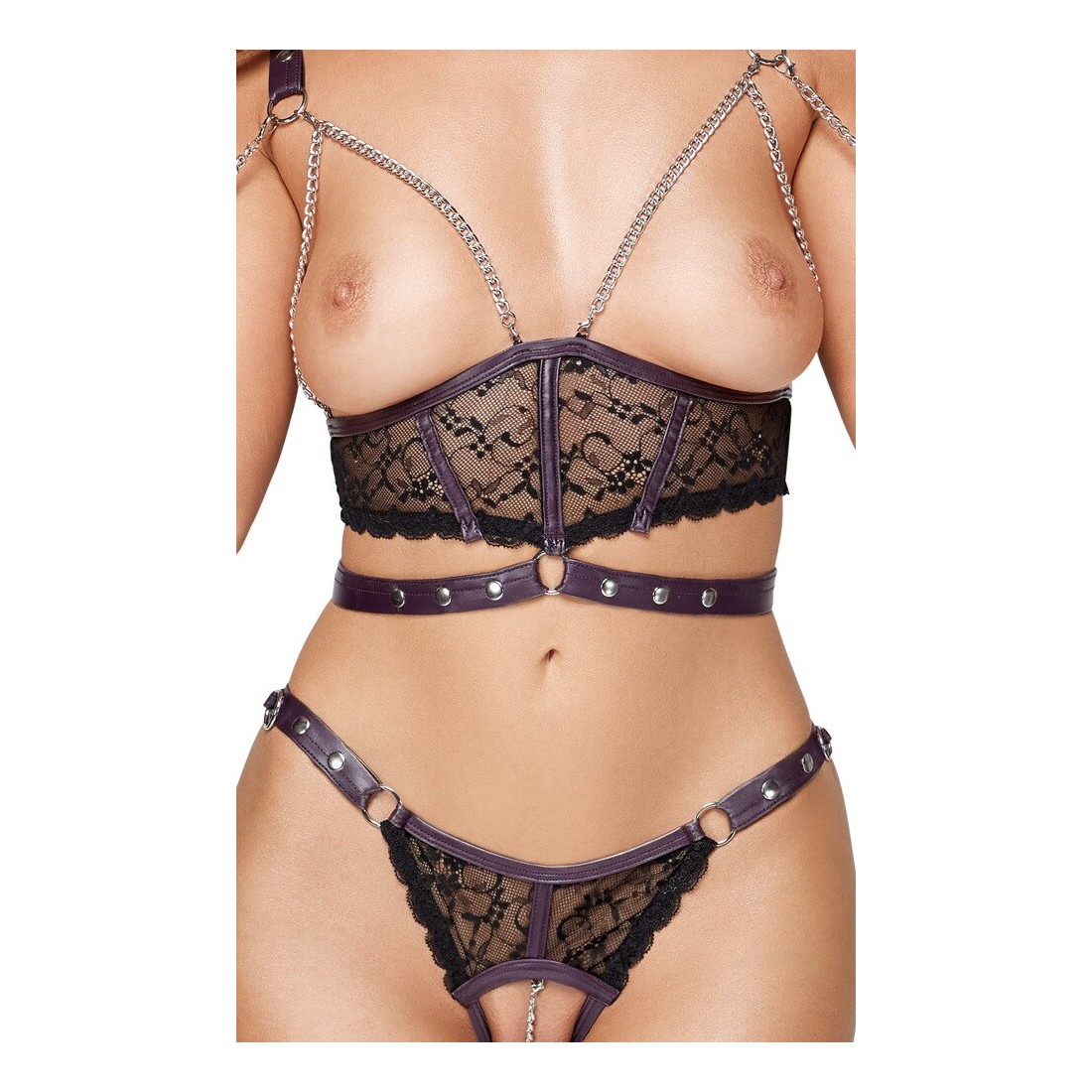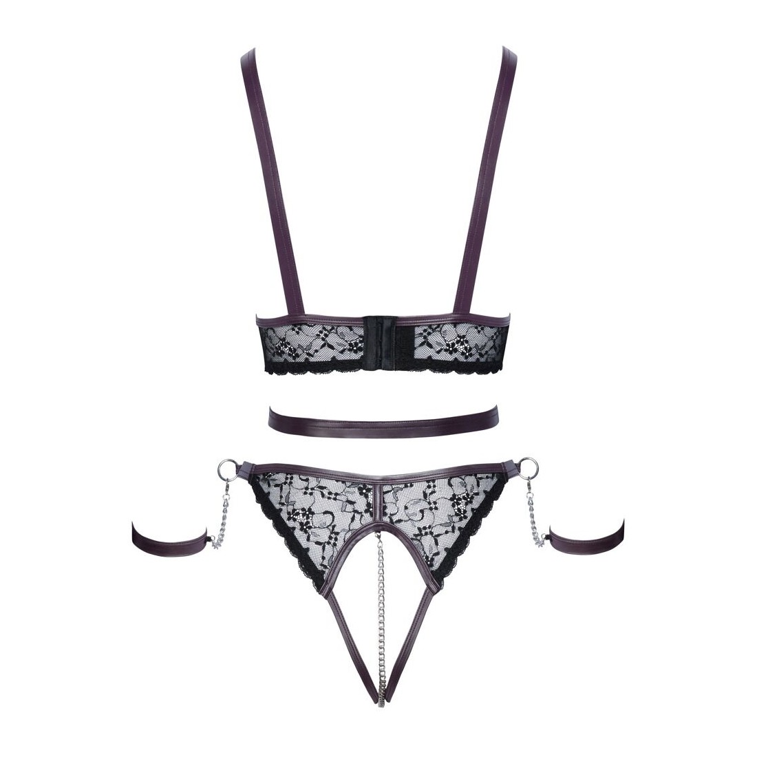 Set Ouvert di Cottelli BONDAGE con top che lascia il seno, slip senza cavallo e due manette morbide. Elegante mix di pregiato pizzo nero con dettagli viola scuro dall'aspetto opaco e accessori color argento. Il top incornicia il seno nudo con catene. La cintura in vita sull'anello anteriore può essere regolata con bottoni a pressione, così come le spalline. Chiusura a gancio regolabile sul retro. Slip con catena stimolante rimovibile nel cavallo aperto. Cintura regolabile con bottoni a pressione. I polsini possono essere agganciati agli anelli laterali della cintura con le loro catene a moschettone. I morbidi polsini alla caviglia possono essere indossati e tolti rapidamente grazie alle loro chiusure in velcro regolabili.