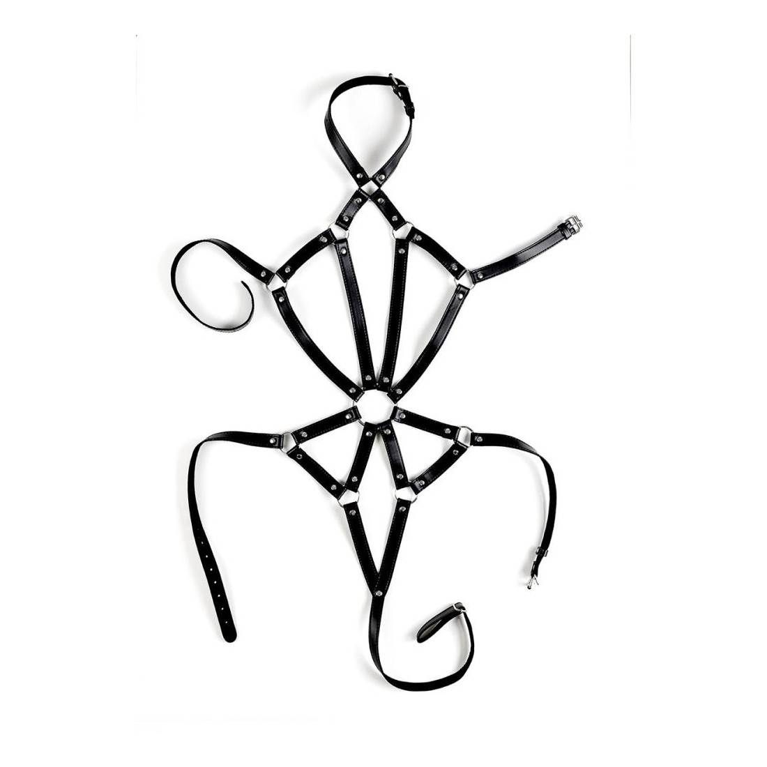 Presenta una serie di cinturini e fibbie regolabili che si incontrano al centro della vita con un grande anello a forma di O.