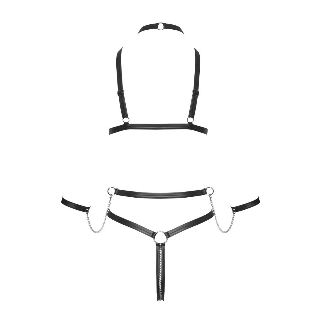 Stravagante harness body crotchless di Bad Kitty realizzato con morbide fasce elastiche in un sofisticato look nero opaco. Con catena a moschettone staccabile nel cavallo aperto. Spalline e collo alto regolabili. Include 2 manette con catene a moschettone che possono essere agganciate agli anelli ai lati del corpo. Le cavigliere strette possono essere regolate rapidamente grazie alle loro chiusure in velcro regolabili.
