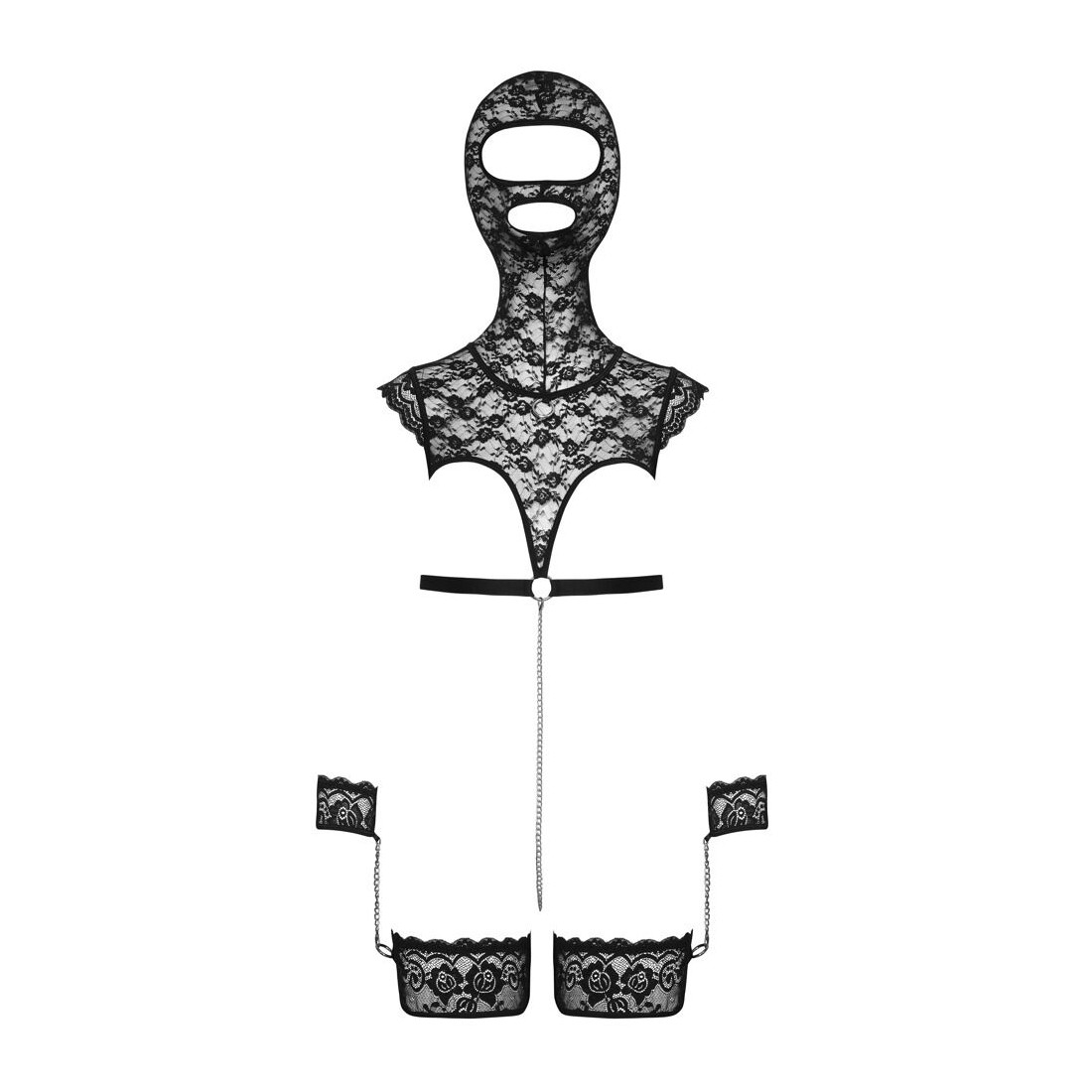 Sofisticato set overt di Bad Kitty in pregiato pizzo nero con accessori color argento. Il top con busto e pancia scoperti e maschera per la testa è completato da 2 polsini per le cosce/mani. Il pizzo elasticizzato si adatta in modo morbido e confortevole. Il top in pizzo che copre le spalle ha un anello bondage sul davanti del collo e cinghie elastiche sul sottoseno. Una lunga catena passa dall'anello del sottoseno attraverso l'inguine fino all'anello posteriore per la stimolazione. La catena può anche essere rimossa completamente. Maschera per la testa allegata con aperture per occhi e bocca. Le manette in morbido pizzo per le cosce e le mani si infilano semplicemente. Le catene delle manette possono essere rimosse dagli anelli dei polsini delle cosce.