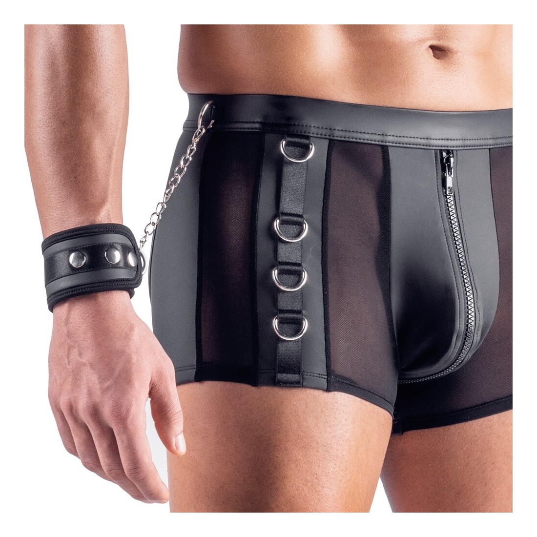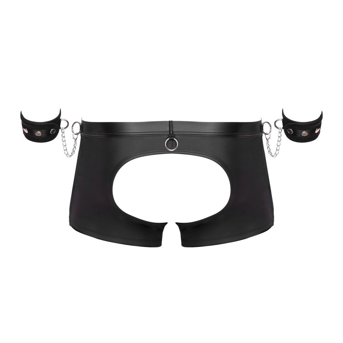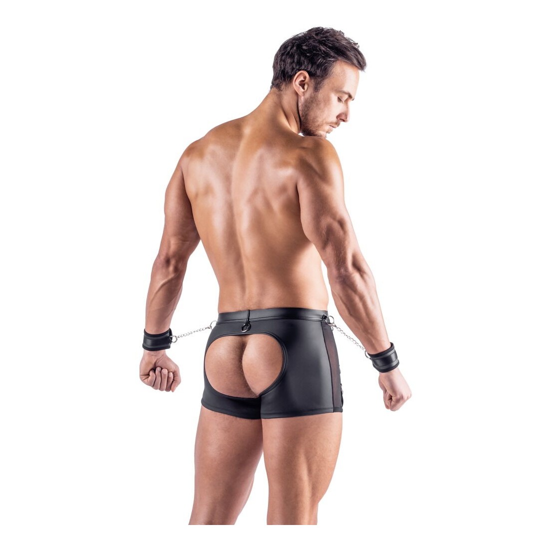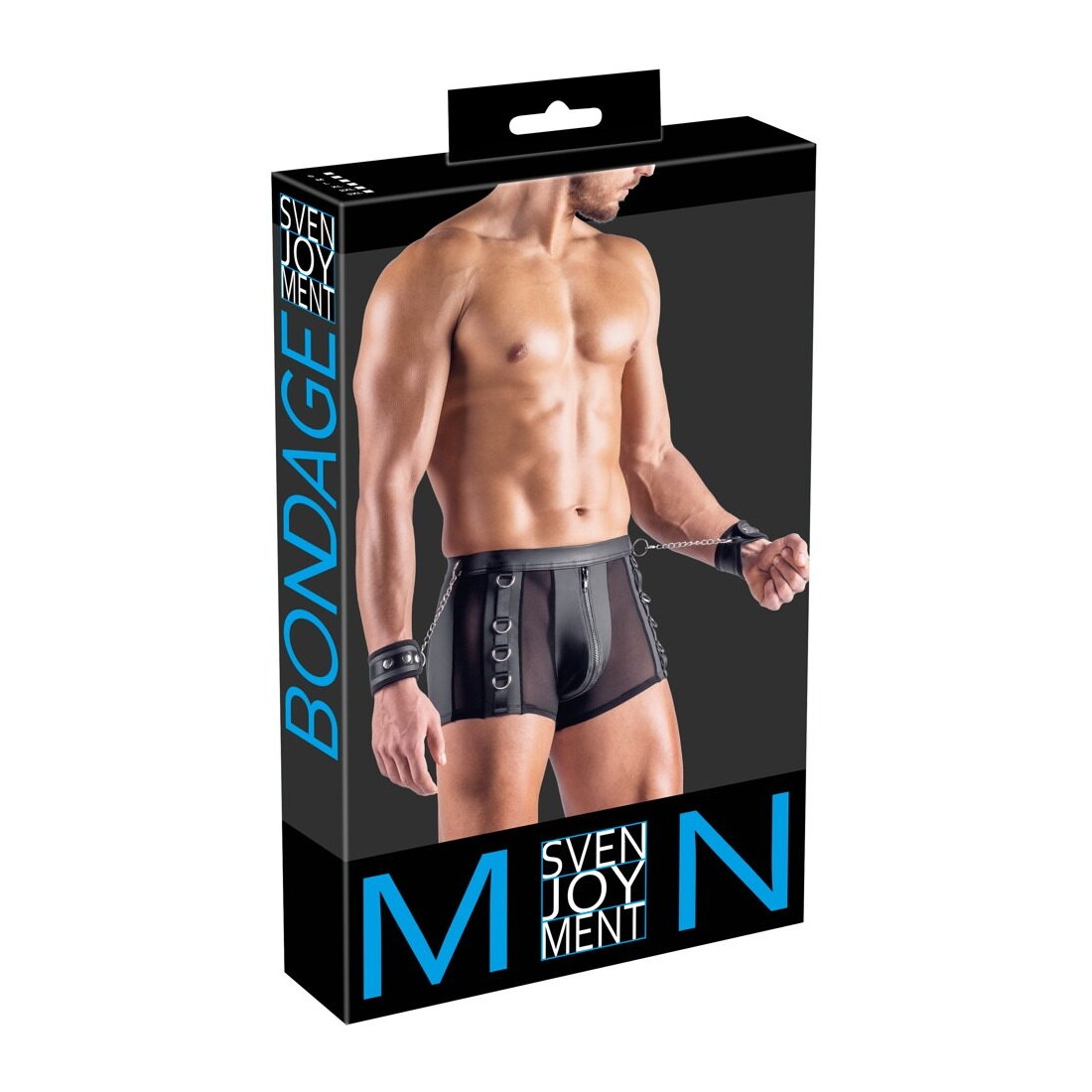 Pantaloni neri di Svenjoyment Bondage con manette morbide. Eccitanti pantaloni senza slip in un fresco mix di materiali a rete e aspetto opaco con dettagli in metallo color argento. Morbidi ed elasticizzati per il massimo comfort. Con cerniera nel marsupio. Anelli sul girovita coperto e sui lati, in cui è possibile agganciare rapidamente le manette incluse con le loro catene a moschettone. I polsini morbidi e opachi possono essere indossati e regolati rapidamente con chiusure in velcro.