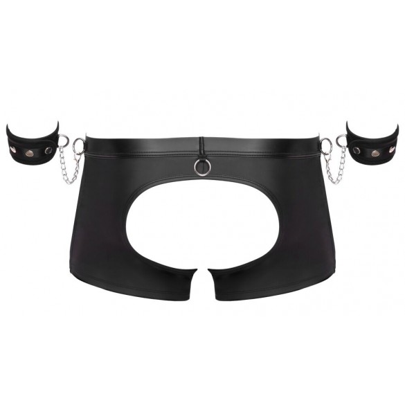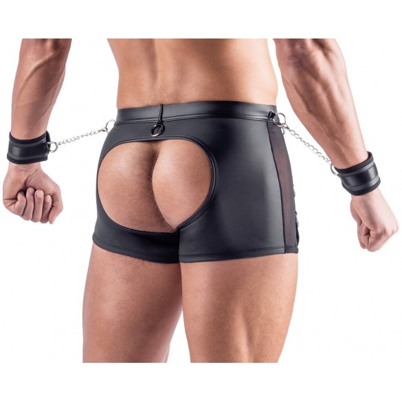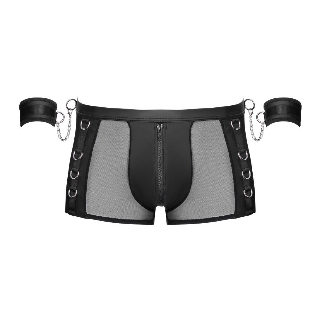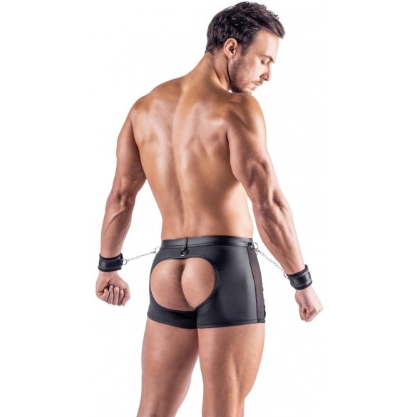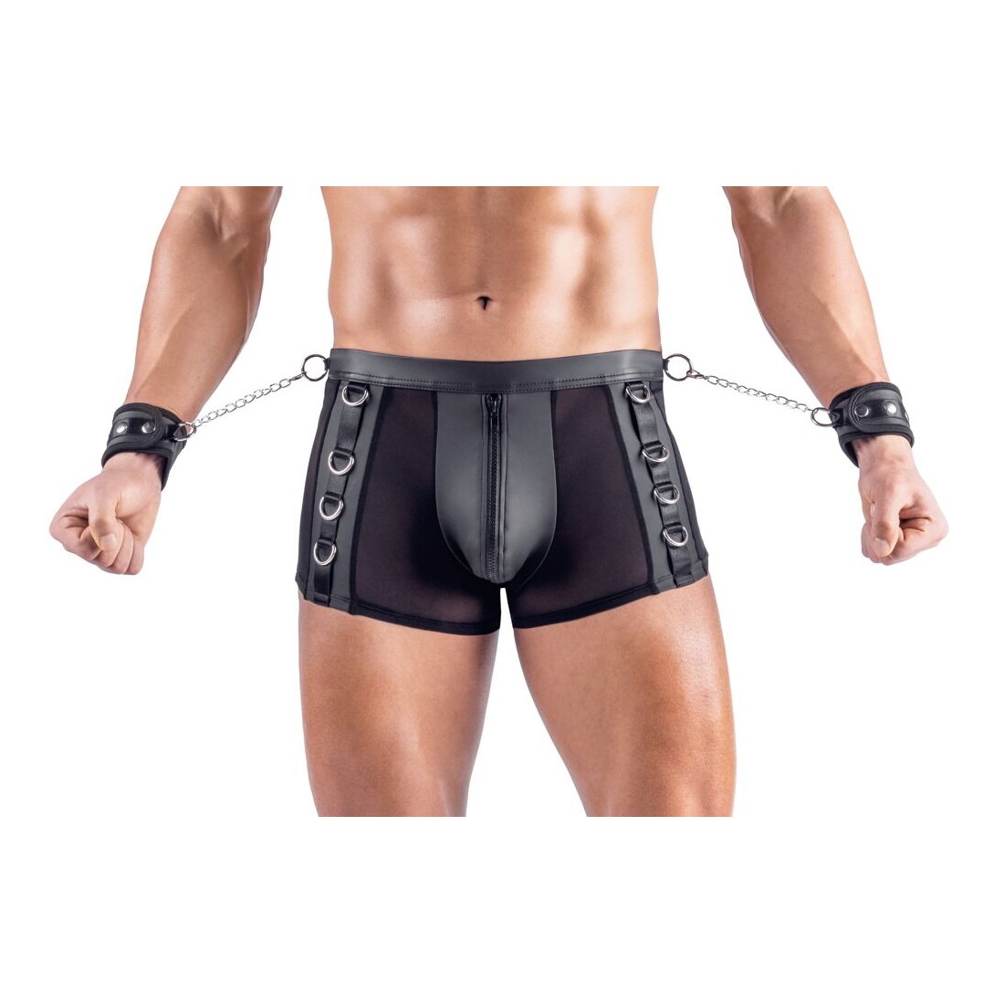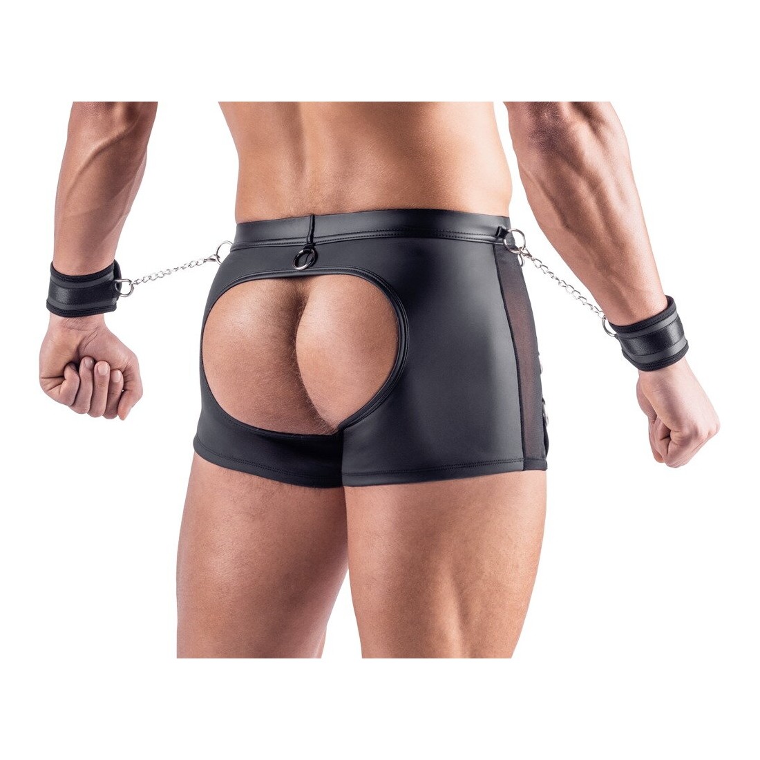 Pantaloni neri di Svenjoyment Bondage con manette morbide. Eccitanti pantaloni senza slip in un fresco mix di materiali a rete e aspetto opaco con dettagli in metallo color argento. Morbidi ed elasticizzati per il massimo comfort. Con cerniera nel marsupio. Anelli sul girovita coperto e sui lati, in cui è possibile agganciare rapidamente le manette incluse con le loro catene a moschettone. I polsini morbidi e opachi possono essere indossati e regolati rapidamente con chiusure in velcro.
