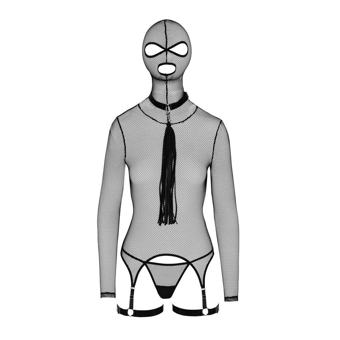 Camicia a rete con maniche lunghe, maschera a rete, perizoma Con collare e flogger M